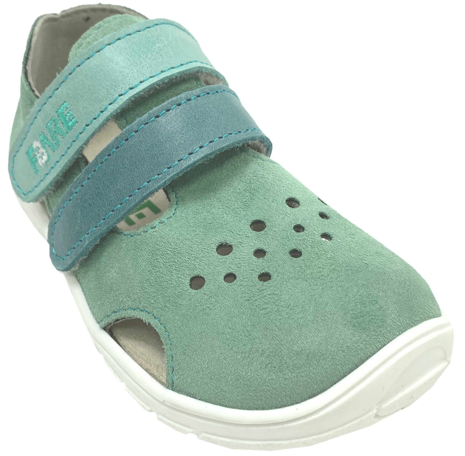 Luftige, leichte Halbsandalen / Barfusandalen von FARE BARE aus Tschechien – ideal für warme Tage, mit quer- und längsflexibler Gummisohle, weichem Nubukleder als Obermaterial, angenehmem Mikrofaser-Innenfutter und schützendem Zehenbereich. Zwei Klettverschlüsse ermöglichen eine optimale Anpassung an den Kinderfuß.