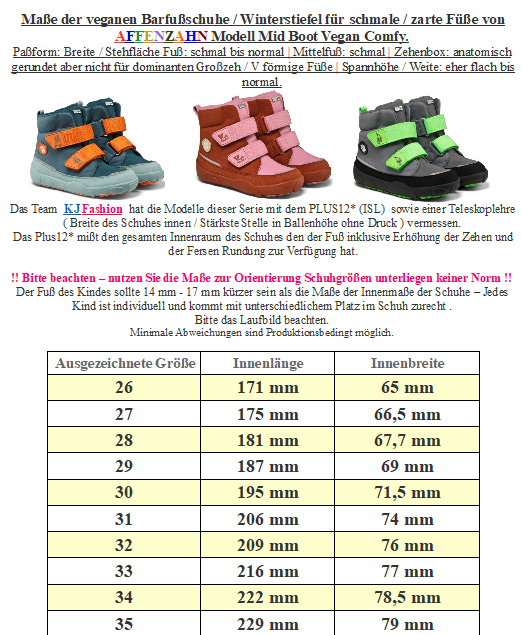 Die robusten und ultraleichten und richtig kuschelig dick gefütterte Winter-Barfußstiefel / Wintergummistiefel von Lurchi Barefoot vereinen Wärme, Flexibilität und Schutz – perfekt für aktive Kinderfüße in der kalten Jahreszeit. > Bitte beachten Sie die im Bild angegebenen Maße, um unnötige Rücksendungen zu vermeiden. Bei Fragen wenden Sie sich gerne vor dem Kauf per E-Mail an uns. Ihr Team KJ Fashion! < Modell: Jan Barefoot 15L6003001 OLIVEMaterial: Mikrofaser & Synthetisch | Innenfutter: Synthetik, Kuschelfell | Innensohle fest vernäht: Schurwolle / Synthetik Mix | Sohle + unterer Schuh: TPE (Thermoplastische Elastomere) Vor dem ersten Tragen und nach dem der Schuh nass war immer imprägnieren – Schuh immer gut durchtrocknen lassem!Weite (diese bezieht sich auf das Volumen / Spannhöhe ) normal bis minimal höher | Leisten Breite (Stehfläche Fuß) normal bis etwas breitere Füße | Mittelfuß: normal | Ferse: normal | Zehenbox: gerundet, anatomische Form - Super leichte, robuste Winterstiefel / Barfußschuhe für Kinder - Flexible, sehr griffige Außensohle mit tollem Profil - Innensohle fest vernäht aus wärmendem Schurwollmix - Innenfutter aus dickem, kuscheligem Kunstfell für extra Wärme - Außenmaterial des Oberschuhes leicht wasserabweisend, unterer Schuh aus TPE wasserfest, extrem biegsam & robust - Breite, anatomisch geformte Zehenbox für viel Bewegungsfreiheit - Praktische Verschlüsse: Klett über dem Gummieinsatz + flexibler Schaft mit Kordelstopper zur Regulierung an Wadenhöhe Ein optimaler Stiefel für kalte Tage für Kids die richtig aktiv sind und einen guten Gripp benötigen. Wärmend, super flexibel, schützt zuverlässig vor Kälte von LURCHI Barefoot. !! Hinweis zum trocknen !! Für warme Kinderfüße empfehlen sich locker sitzende Woll- oder Funktionssocken. Sie nehmen Feuchtigkeit langsamer auf bzw. leiten sie ab und verhindern so ein schnelles Auskühlen – besser als Baumwollsocken. -> Hier geht es zu unseren Woll- und Funktionssocken