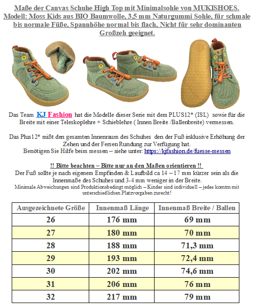 Sportlich stylische, vegane Barfußschuhe in trendiger Form - super leicht, weich und extrem flexibel. Das sind diese High Top Sneaker aus robuster Bio Baumwolle in Canvas Qualität mit Elastiksenkeln und Schnellverschluß, in mattem Grün mit super weicher, flexibler 2,5 mm Naturkautschuksohle von MUKISHOES Kids, handgefertig und Fair produziert in Portugal. !! KJ FASHION Tip: Bitte dringend das Bild mit den genauen Innensohlenmaßen je Größe beachten - Breite wird mit Druck ( Clevermess siehe Tabelle Beschr. gemessen) !! Bei Fragen gerne Mail an uns :-) Modell: Challenge Kids in matt Gelb / Grün Material VEGAN, Obermaterial : weich gefärbte Bio-Baumwolle in grün / blau | Futter: Bio-Baumwolle in hell lila | Sohle: 2,5 mm starker Naturkautschuk in pastellgelb | Schnürsenkel : elastischer Gummi, umwickelt mit Bio-BaumwollschnurPaßform: Leiste (Standfläche Fuß - als Breite bezeichnet ) Mittel | Weite ( beschreibt das Volumen auch als Spannhöhe bezeichnet) : normal & variierbar | Mittelfuß: normal | Ferse: normal | Zehenbox: Anatomisch geformt, nicht für sehr dominanten Großzeh - weiche BIO Baumwolle in grober Canvas Qualität dicht gewebt, bis knapp über den Knöchel gehend - Mid Top Höhe - derbe Ösen für gute Haltbarkeit, kindgerechter Schnellverschluß mit gut dehnbaren Elastiksenkeln zum regulieren der Spannhöhe - schlichte Optik aber nicht langweilig durch gesetzte Ziernähte und Ton in Ton gehaltene Einsätze - Ferse innen weich abgepolstert, innen mit weicher Bio Baumwolle ausgelegt - fest vernähte Innensohle um ein verrutschen zu vermeiden - extrem weiche, flexible 2,5 mm Gummisohle mit leichtem Noppenprofil !! Bitte bei empfindlichen Füßen mit Söckchen tragen um zu starke Reibung an der ungeschützten Haut zu vermeiden - beim probieren bitte IMMER mit Socken!! Ein richtig sportlich schicker Sneaker mit extrem geringen Gewicht und einfach super weich und biegsam von MUKISHOES. Durch die extra weichen und leichten Materialien der Schuhe ( das besondere an dem Schuh ) bitte beachten das dies nicht zum Laufrad fahren, Bobby Car fahren , generell das starke schleifen des Materials auf Asphalt / Steinen etc. geeignet sind - da dieses das Material extrem beansprucht und es zu Rissen etc kommen kann.