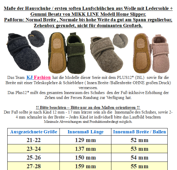 Minimalistische Wollschuhe mit Klettverschluß, weicher Ledersohle mit Gummibesatz, breiter Zehenbox - für die ersten Laufversuche an trockenen Tagen im Freien oder als wärmender Schutz für zu Hause - dafür eignen sich super die Wollslipper von MIKK LINE. !!Bitte die Maße der Schuhe beachten, Größen sind nicht genormt, um so ein unnötiges hin und her senden zu vermeiden - bei Fragen mailen Sie uns einfach vor dem Kauf an - Ihr Team KJ Fashion !! Modell: Non Slip Prewalker / Home Slipper 20007 Anthrazit Melange Material: 100% Wolle / Wollfilz | Sohle: Nubukleder und weiches Gummi zweigeteilt eingenähtPaßform / Leisten ( Stehfläche des Fußes) : für normal breite Füße geeignet | Ferse: normal | Mittelfuß normal | Zehenbox: anatomisch geformt, nicht für sehr ausgeprägten dominanten Großzeh | Spannhöhe: Normal bis etwas höher (regulierbar) - weiche und super flexible sowie leichte Schuhe aus Wollfilz mit minimalistischer Leder Sohle mit rutschemmenden Gummibesätzen - breiter Klettverschluß zum regulieren und anpassen an den Fuß - breite Zehenbox, aber eher rund verlaufend, nicht für stark ausgeprägte V Form - Fersenbereich doppelt genäht für einen guten Halt am Fuß des Kindes - Abschlüsse paspeliert für eine schöne Optik und gute Haltbarkeit Ein prima Schuh für die ersten Laufversuche der kleinen Laufanfänger , an warmen, trockenen Tagen auch prima für draußen um mit den ersten "richtigen" Schuhen noch ein wenig warten zu können. Bitte aber bedenken das es dennoch weiche Wollpuschen sind, Rutschefahrzeug fahren , halten die Schuhe nicht aus auch kein stundenlanges laufen auf Asphalt.