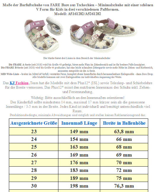Luftige, leichte Halbsandalen / Barfusandalen von FARE BARE aus Tschechien – ideal für warme Tage, mit quer- und längsflexibler Gummisohle, weichem Leder-Obermaterial, angenehmem Mikrofaser-Innenfutter und schützendem Zehenbereich. Zwei Klettverschlüsse ermöglichen eine optimale Anpassung an den Kinderfuß. > Bitte beachten Sie die im Bild angegebenen Maße, um unnötige Rücksendungen zu vermeiden. Bei Fragen wenden Sie sich gerne vor dem Kauf per E-Mail an uns. Ihr Team KJ Fashion! < Modell: B 5461181Material Obermaterial: Leder | Innen: Mikrofaser / Textil | Sohle: Gummimischung Weite (diese bezieht sich auf das Volumen im Schuh) für normal hohen bis etwas höheren Spann geeignet da regulierbar | Breite des Leisten (Stehfläche Fuß) normal | Mittelfuß: normal | Ferse: normal | Zehenbox: anatomisch gerundet geformt - Leichte Halbsandale in Low-Top-Höhe (unter dem Knöchel) - innen leicht gepolsterte Ferse für zusätzlichen Komfort - Innenfutter aus weichem Textil/ Mikrofaser für angenehmes Fußklima - Zwei Klettverschlüsse zur individuellen Anpassung an den Mittelfuß / Weite und der Fessel - Herausnehmbare, seitlich hochgezogene Innensohle, dadurch rutschfest im Schuh - Quer und längs flexible Gummisohle mit Minimalprofil für gute Bewegungsfreiheit - Geschlossener Zehenbereich mit hochgezogener Sohle als Schutzkante Der optimale Schuh für die wärmeren Tage für aktive Kids die einen eher V förmigen Fuß haben. !! Bitte beachten - für extreme Nutzung durch Bobby Car / Laufrad etc bitte geeeignete Schutzkappen über die Schuhe ziehen - da diese dafür nicht ausgelegt sind !!