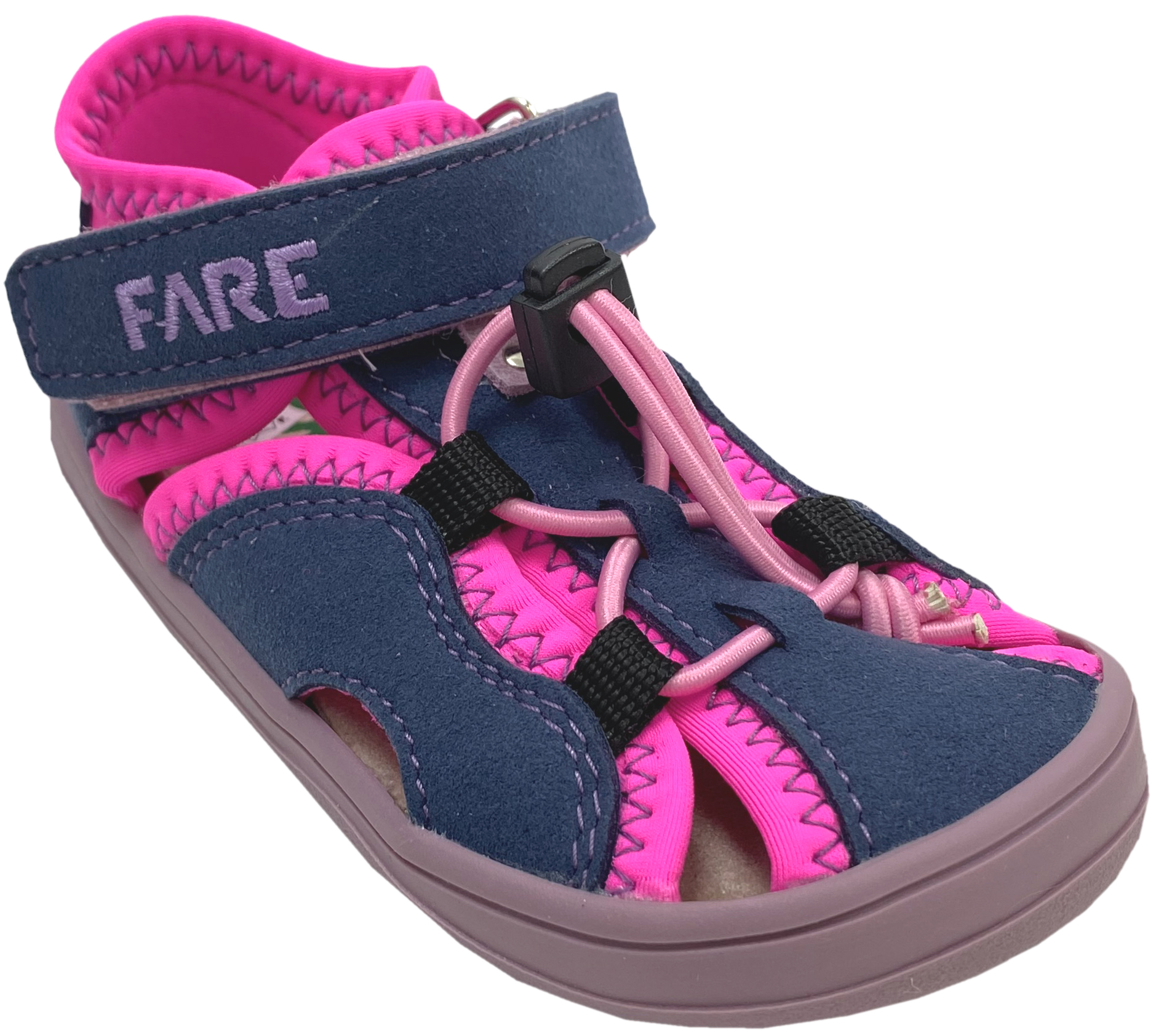 Luftige, leichte Halbsandalen / Barfusandalen ( bei herausgenommener Innensohle ohne Erhöhungen) von FARE BARE aus Tschechien – ideal für warme Tage, mit quer- und längsflexibler Gummisohle, aus weichem Textil / Neopren ähnlich für hohen Tragekomfort, mit schützendem Zehenbereich, ein breiter Klettverschluß plus ein elastischer Schnellverschluß ermöglichen eine optimale Anpassung an den Kinderfuß.