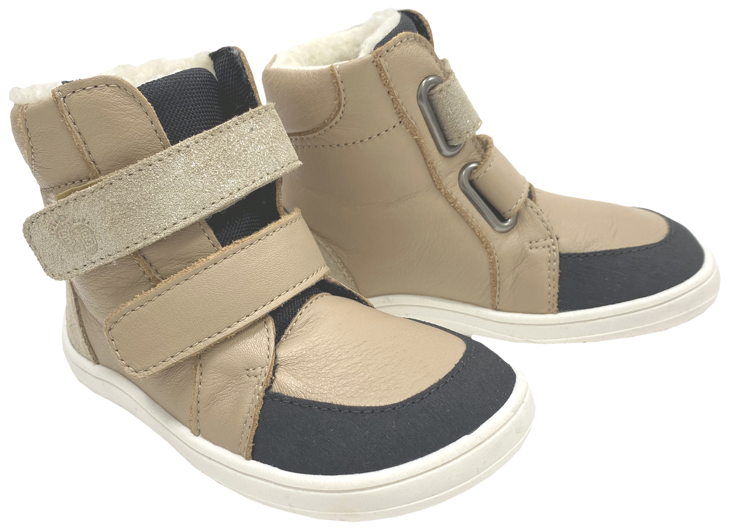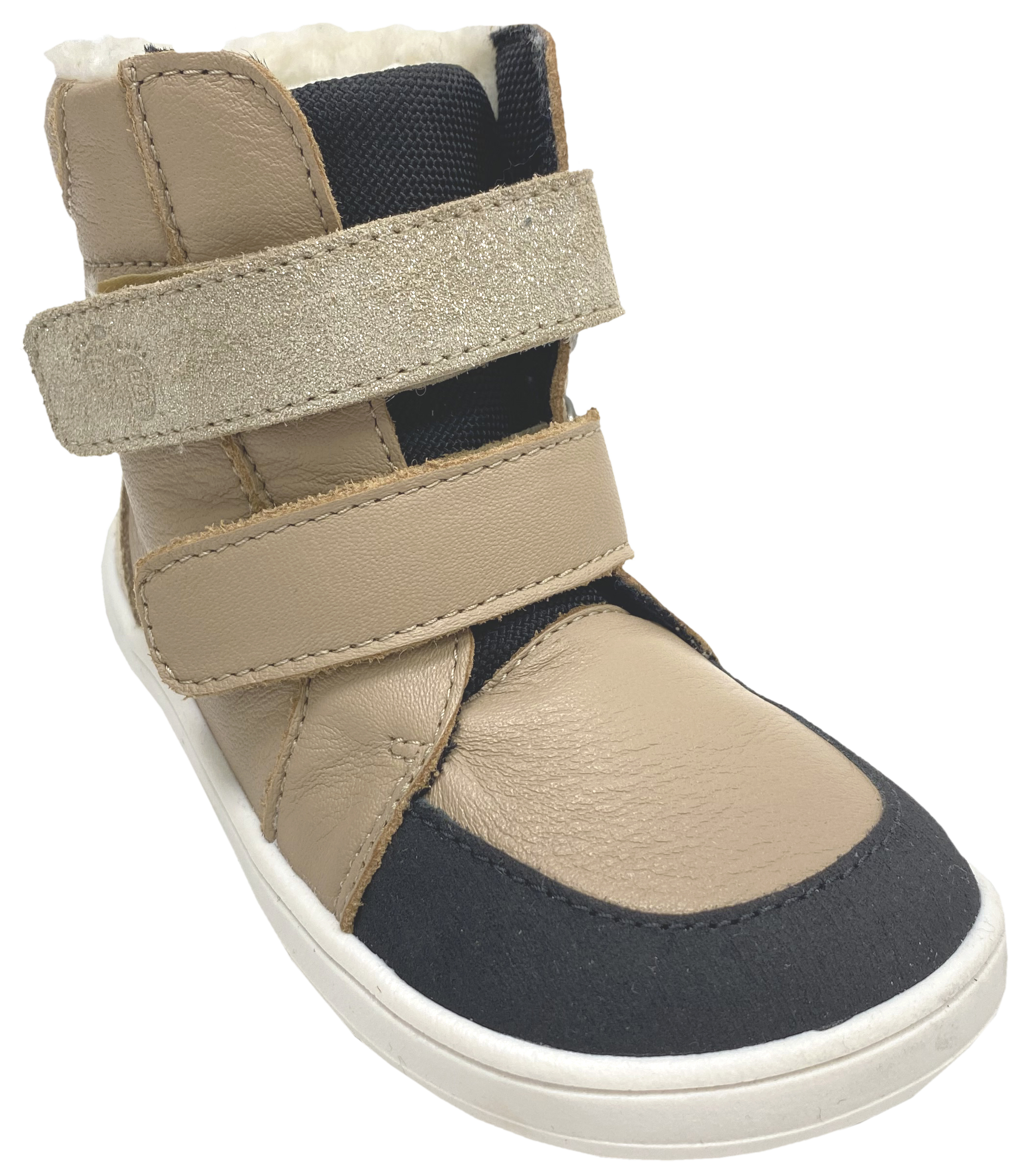 Super leichte und bequeme Stiefel aus weichem Leder mit kuscheligem, textilen Kunstfellfutter, dazwischen mit der Tex Membran gearbeitet, mit Doppelklett zu schließen (ab Gr. 34 mit 3 Klettstreifen), aus der Zentralslowakai von BABY BARE - ein kleiner Produzent von Barfußschuhen mit Minimalsohlen für Kinder.