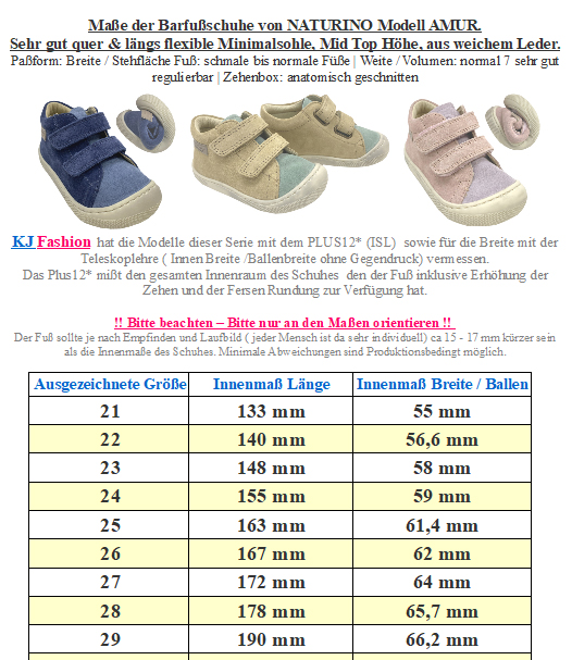 Schicke Barfußschuhe mit softer, quer und längs flexibler Gummisohle aus weichem Wildleder, mit sehr gut am Fuß zu regulierender Schnürung, Chrom frei gegerbtem Leder als Innenfuttter von NATURINO aus der Barefootlinie. !!Bitte das Bild der Innenmaße beachten, um so ein unnötiges hin und her senden zu vermeiden - bei Fragen gerne eine Mail vor dem Kauf, Ihr Team KJ Fashion !! Modell: Barefoot Amur Suede in Mint mit buntem Flower MusterMaterial: Wildleder | Innen: Glattleder | Sohle: GummiWeite (diese bezieht sich auf das Volumen im Schuh) M - S also für normal hohen bis flachen Spann geeignet | Breite des Leisten (Stehfläche Fuß) normal bis schmal | Mittelfuß: normal bis schmal | Ferse: normal bis schmal | Zehenbox: anatomisch gerundet geformt - Halbschuh in seitlich etwas höherer Form bis knapp am Gelenkknöchel endend - abgepolsterter Einstieg, innen mit weichem Glattleder ausgelegt - Zunge flach gearbeitet um ein drücken zu vermeiden - mit Rundsenkeln optimal an den Mittelfuß anzupassen und so auch super im Umfang / der Weite zu regulieren - herausnehmbare, mit Leder bezogene Sohle ohne versteckte Erhöhungen / Polster - quer und längs flexible Gummisohle mit Minimalprofil, Nullabsatz und keinerlei Erhöhungen im Mittelfuß oder der Ferse Zero Drop - an der Spitze im Zehenbereich ist die Sohle etwas hochgezogen als Schutzkante Der optimale Schuh für den Übergang für Kinder mit etwas schmaleren bis normal breiten Füßen von dem italienischen Schuhherstelller mit der Barefoot Serie Naturino. !! Bitte beachten - für extreme Nutzung durch Bobby Car / Laufrad etc bitte geeeignete Schutzkappen über die Schuhe ziehen - da diese dafür nicht ausgelegt sind !!