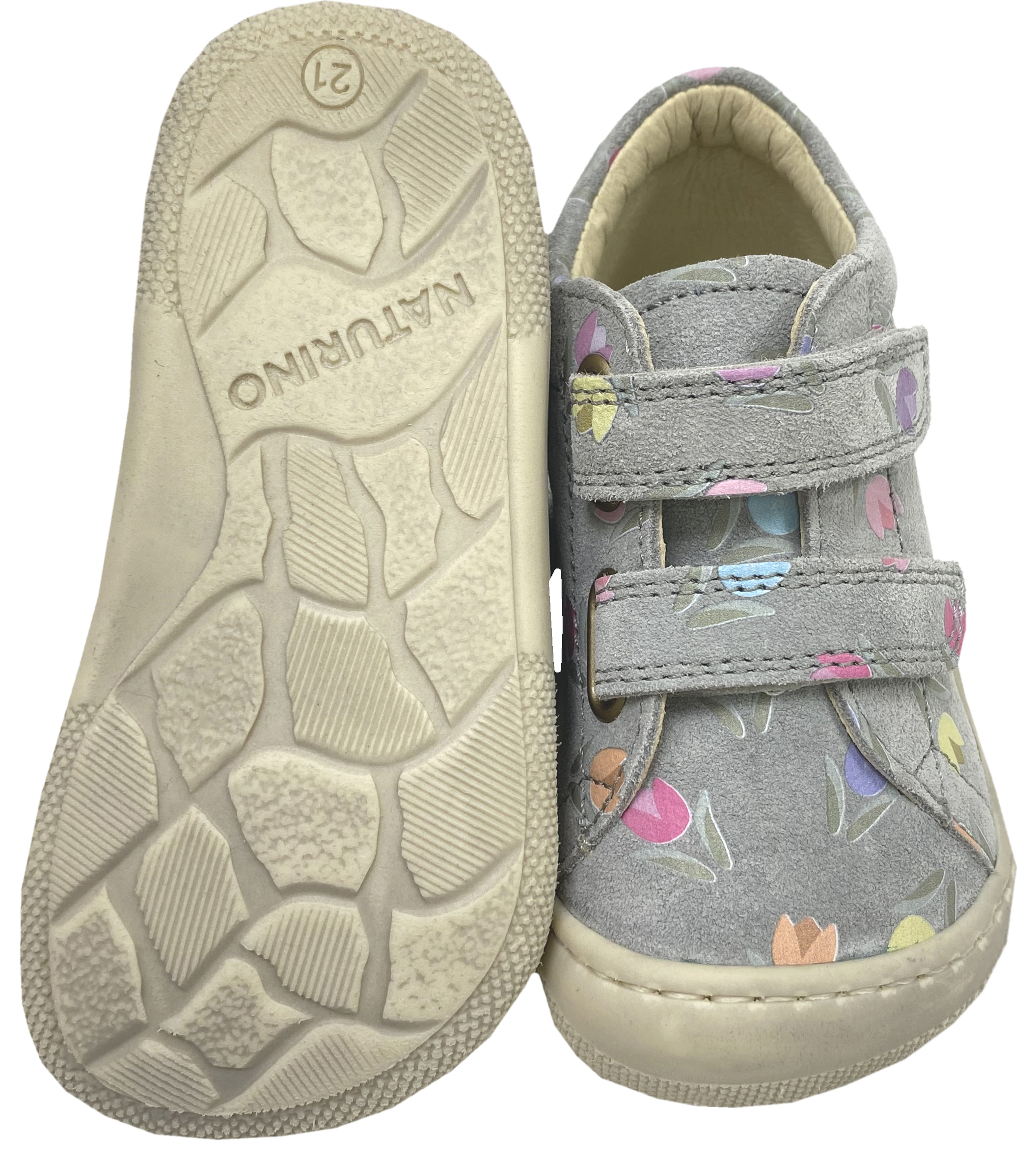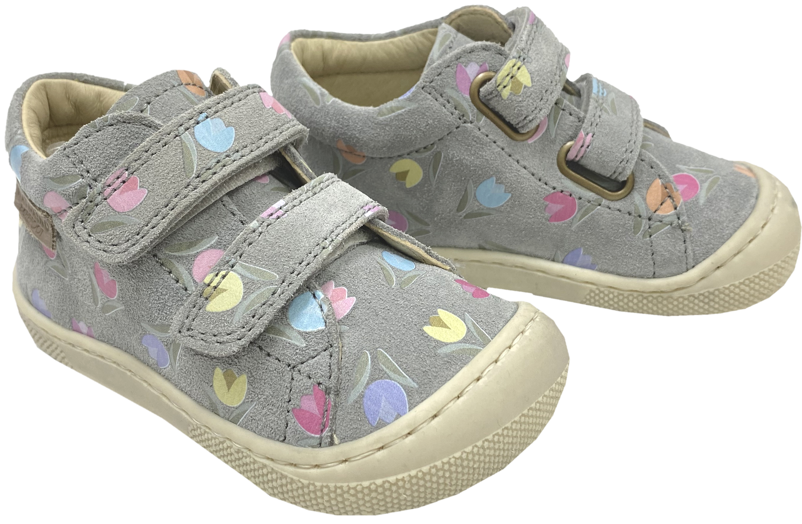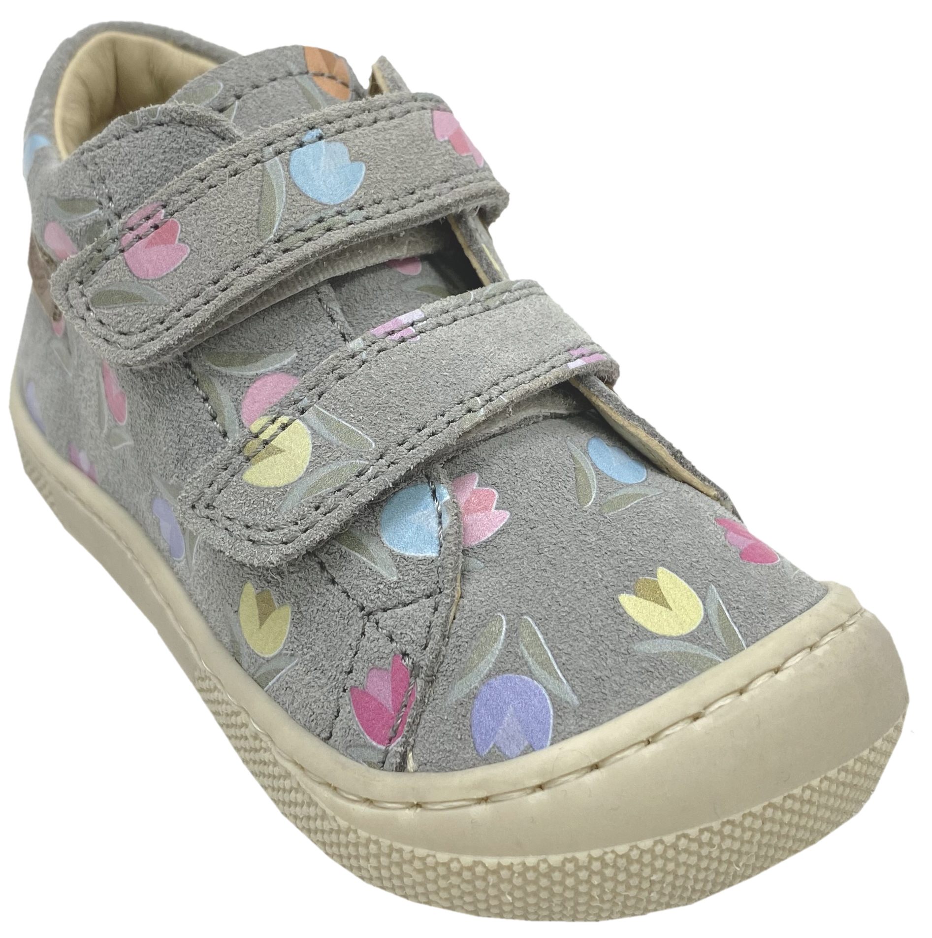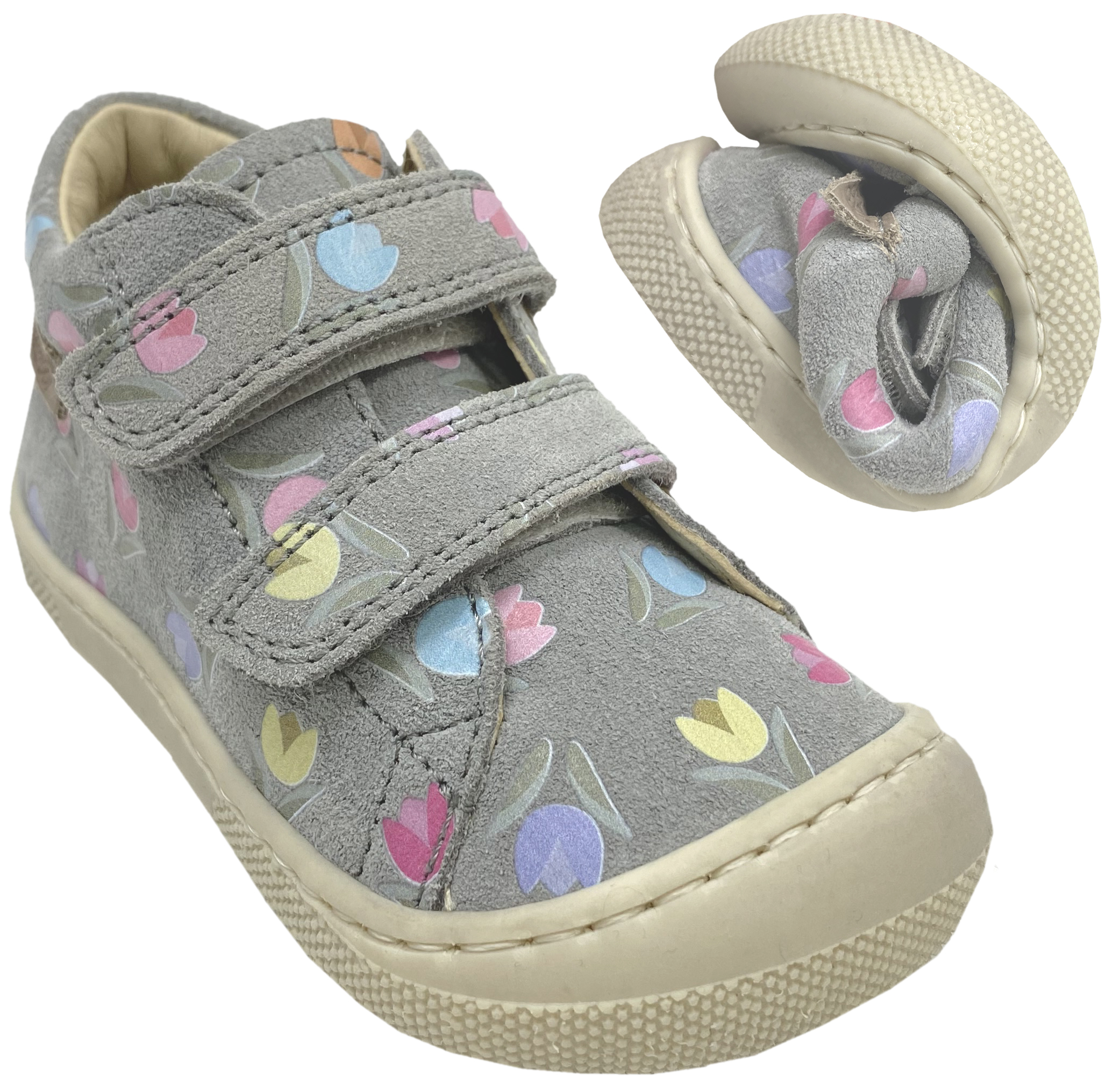 Produktinformationen "Barfußschuhe aus Wildleder mit Doppelklett Modell AMUR in Grau mit Tulpen von NATURINO"