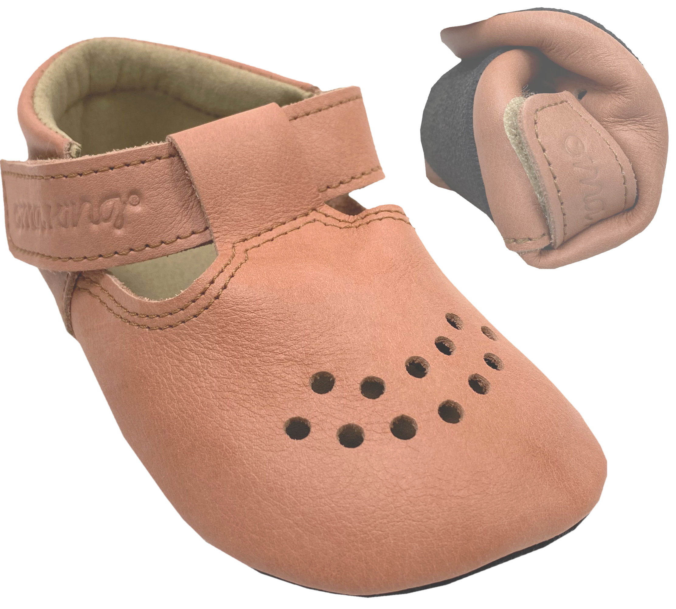 Super leichte und ganz knautschig weiche Lederschuhe mit 1 mm dünner TPU Gummisohle und innen einer 2 mm Latex Innensohle mit einem Lederbezug, mit Stanzungen im Leder um so eine optimale Belüftung des Fußes zu gewährleisten und 2 seitlichen Klettriegeln zum regulieren an die Fessel. Tolle Barfußschuhe / ersten Schuhe mit Minimalsohle von TIKKI - mit Liebe handgefertigt in Rumänien. !! KJ FASHION Tip: Bitte das Bild mit den Innenmaßen je Größe als Orientierung beachten !! Bei Fragen gerne Mail an uns : info - at - kj-fashion.de :-) Modell: ZIGGY Cappuccino in hellem Braun / BeigeMaterial: Premium Leder | Innensohle: 2 mm Latex mit Lederbezug | Laufsohle: 1 mm TPU GummiPaßform der Schuhe (Standfläche Fuß - als Breite bezeichnet ) normale Breite | Weite ( beschreibt das Volumen auch als Spannhöhe bezeichnet) : normal bis minimal höher | Mittelfuß: normal | Ferse: normal bis schmal | Zehenbox: Anatomisch geformt - Lederschuhe mit robuster aber dennoch weicher Gummisohle - kleine Cut Outs / Stanzungen im Leder sorgen für eine gute Belüftung der Füße - seitlich jeweils mit einem kleinen Klettriegel zu regulieren - an der Ferse leicht verstärkt für eine gute Paßform und am Abschluß mit einer kleinen Anziehlasche versehen Ein herrlich leichter Barfußschuh für wärme Tage, als erster Schuh im Alltag oder auch als Schuh für Indoor von TIKKI. !! Durch die extra weichen und leichten Materialien der Schuhe, bitte beachten das diese nicht zum Laufrad fahren, Bobby Car fahren etc, generell das starke schleifen des Materials auf Asphalt / Steinen etc. geeignet sind - da dieses das Material extrem beansprucht und es zu Rissen etc kommen kann. Bitte besser geeignete Schutzkappen nutzen. !!