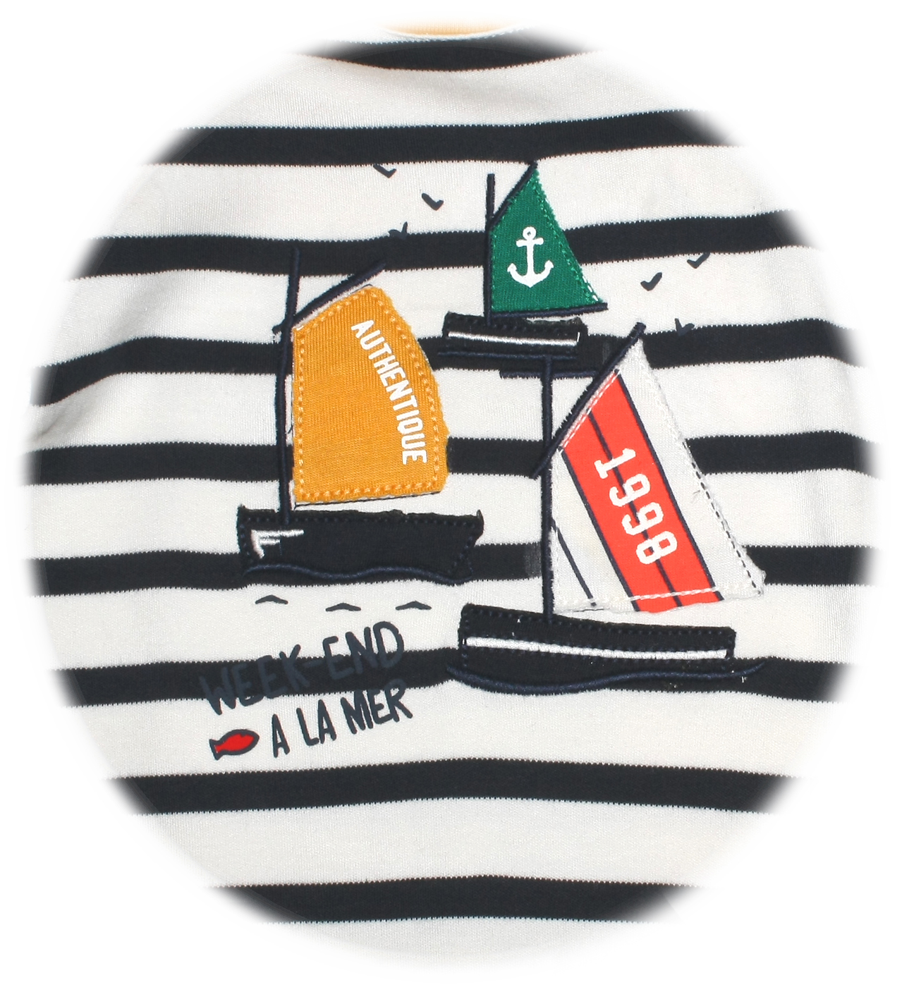 Schicker Einteiler aus weichem Interlock, reine Baumwolle, in einem Ecru / Offwhite Ton mit Streifen in Dark Navy und einem Frontstick kleiner Segelboote, für kleine Jungen von dem französischem Label Week end á la Mer, mit dem wunderbar maritimen, schlichten Design.