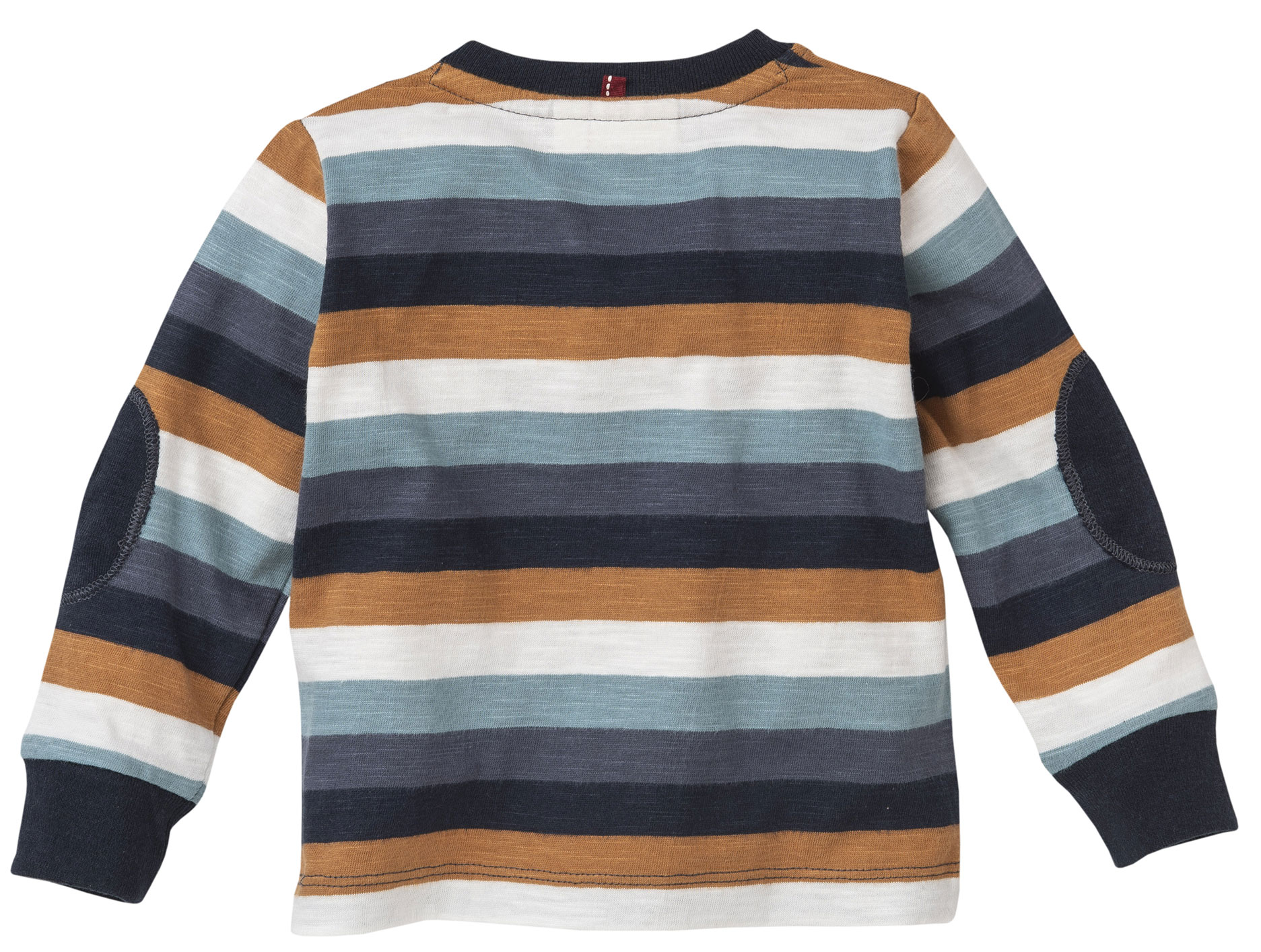 Cooles Langarmshirt in breiten Streifen in gedeckten Erdtönen, Marine, Grey Mint, Ockergelb und Offwhite, mit Ellebogen Patches, für kleine Jungen aus weicher Bio Baumwolle mit GOTS Zertifizierung von PEOPLE.
