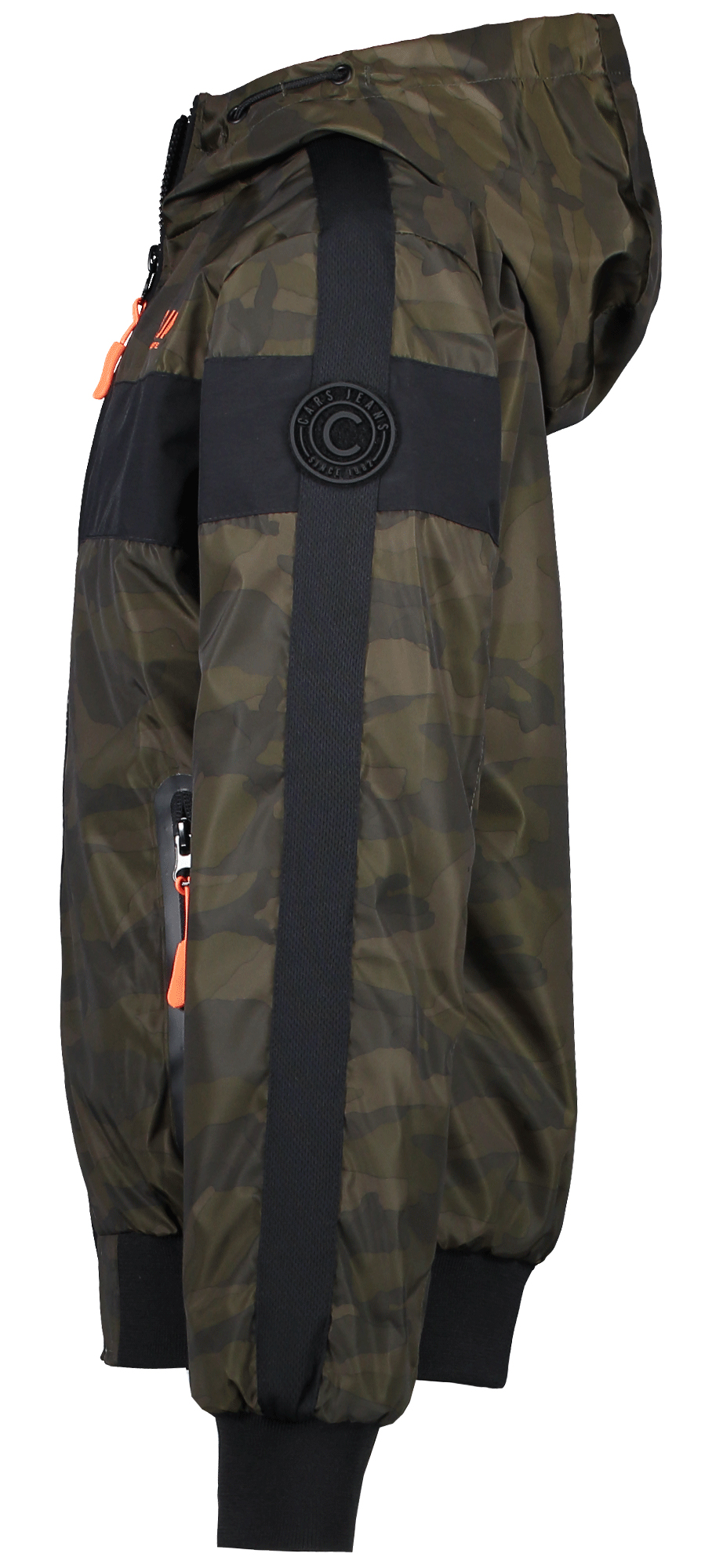 Richtig coole Sommerjacke / Übergangsjacke in einem gedeckten Army Green Oliv Ton mit Camouflage Muster aus wasserabweisendem Material, innen mit weichem Textil ausgelegt, reflektierende Elemente, Webband in Schwarz am Ärmel, für Jungen von dem niederländischem Jeans / Fashion Label CARS JEANS.