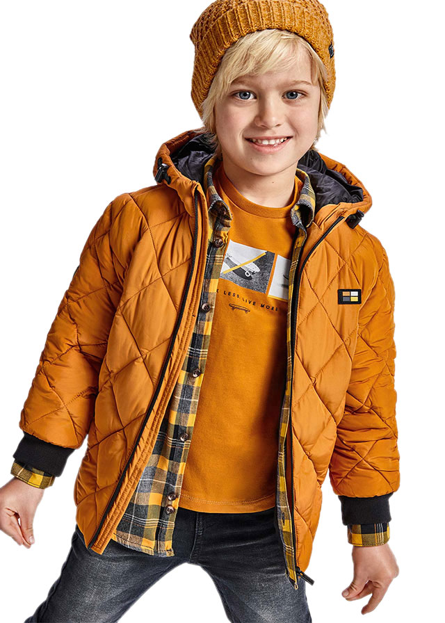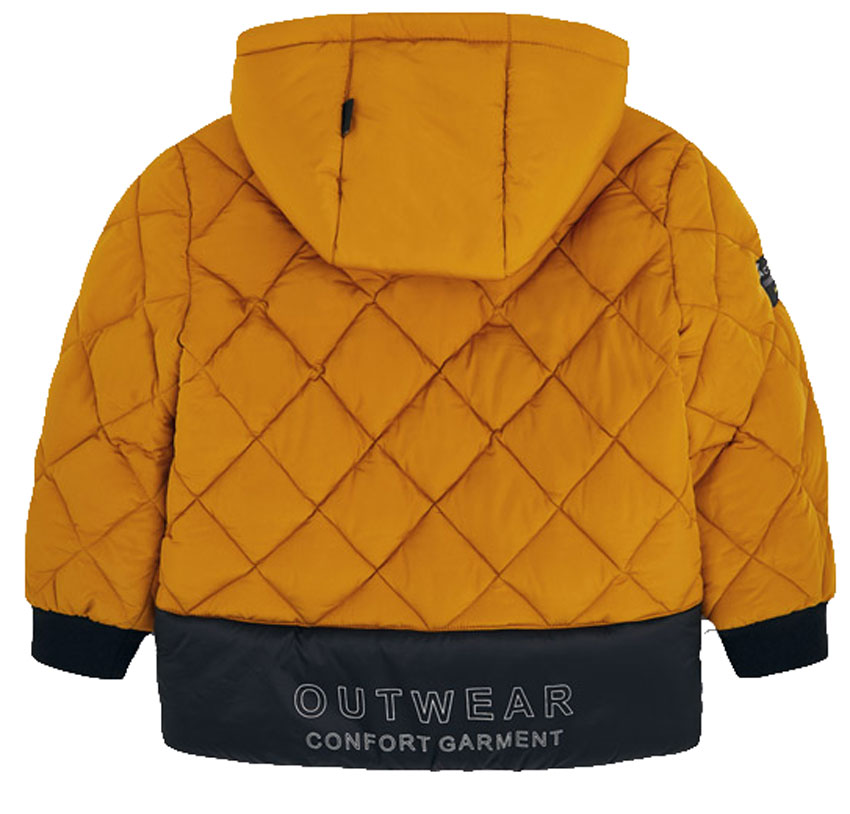 Sportlich lässige Jacke / Übergangsjacke mit leichter bis mittlerer Wattierung in Rautensteppung, wasserabweisendes Obermaterial, innen glatt getaftet, in einem dunklen Ockergelb Ton mit schwarzem Einsatz am Rücken, für Jungen von MAYORAL aus Spanien.