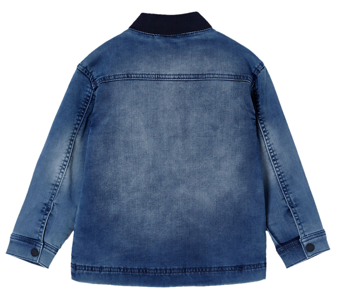 Stylische und super weiche Jeansjacke in gewaschenem Medium Blue im Collegestil, mit derben Druckknöpfen zu öffnen und geripptem Kragen, für Jungen von MAYORAL - dem Nr. 1 Kindermode Label aus Spanien.