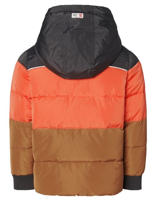 Lässig schicke Winterjacke mit breiter Steppung und mittlerer Wattierung, optimal für unsere Wintertage, in Grau, Orange und einem Hellbraun / Bronze Ton gehalten, mit reflektierendem Print, großer Kapuze, für Jungen von dem Niederländischem Baby- , Kinder- und Schwangerschafts Label NOPPIES.