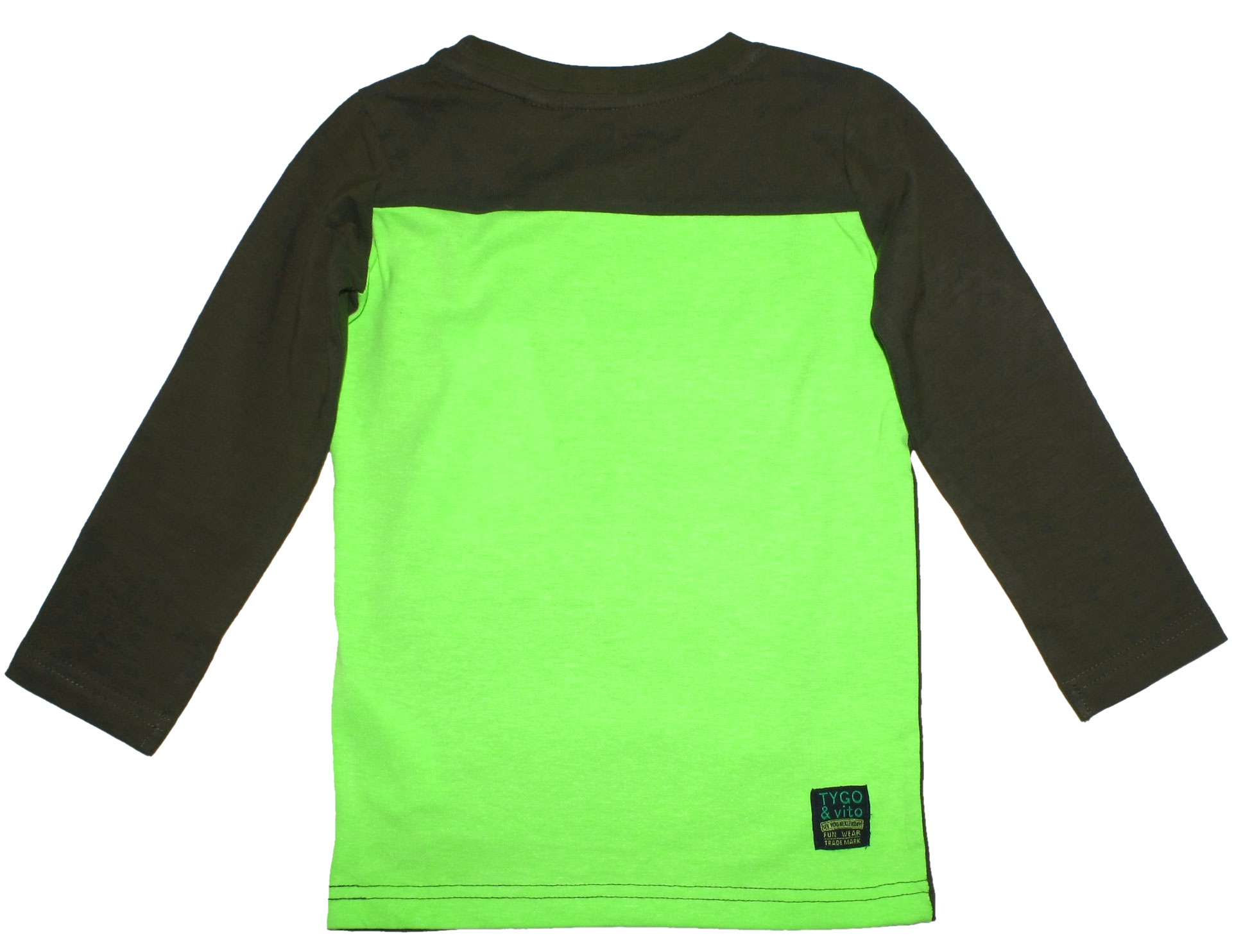 Schmal geschnittenes Longsleeve in einem dunklen, gedeckten Army Ton aus weichem Baumwoll Jersey ( Cotton made in Africa) mittig mit einem Erdball Print, der Rückenbereich ist in einem Neon Grün Ton gehalten, für Boys von dem niederländischem Label TYGO & vito.