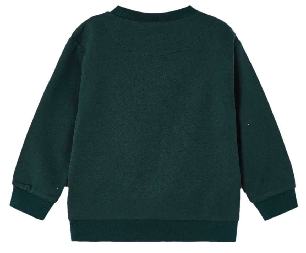 Kuschelig weicher Sweater in einem gedeckten, dunklem Grün Ton mit blauem Logo Print mittig, innen super weich gerauht und perfekt für kühere Tage für Jungen von MAYORAL aus Spanien.