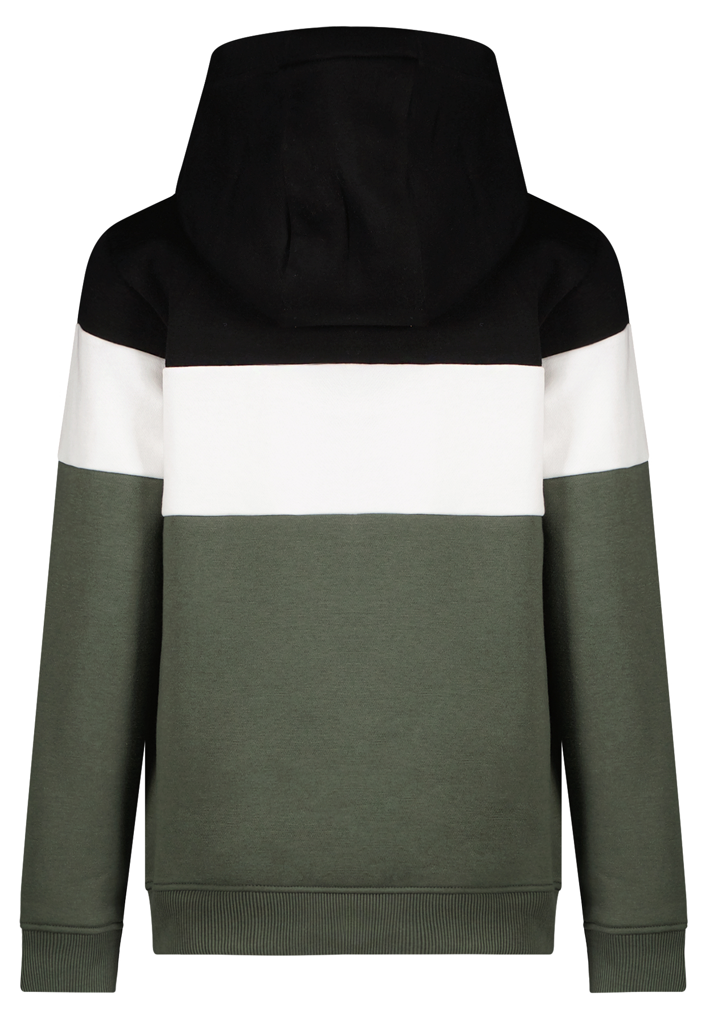 Lässig cooler Sweater mit Kapuze aus dickem, innen kuschelig weich gerauhtem Baumwoll Sweat in Schwarz / Weiß und einem breiten einsatz in Oliv Grün, für trendige Jungen von dem Denim & Fashion Label CARS JEANS aus den Niederlanden.