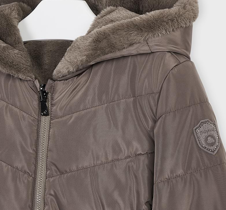 Schlicht und edel gearbeitete Winterjacke zum wenden in einem gedeckten, leicht schimmerndem Toffee Braun Ton, wertig von beiden Seiten gearbeitet, mit Kapuze für die kühleren Tage optimal geeignet von MAYORAL aus Spanien für Mädchen.