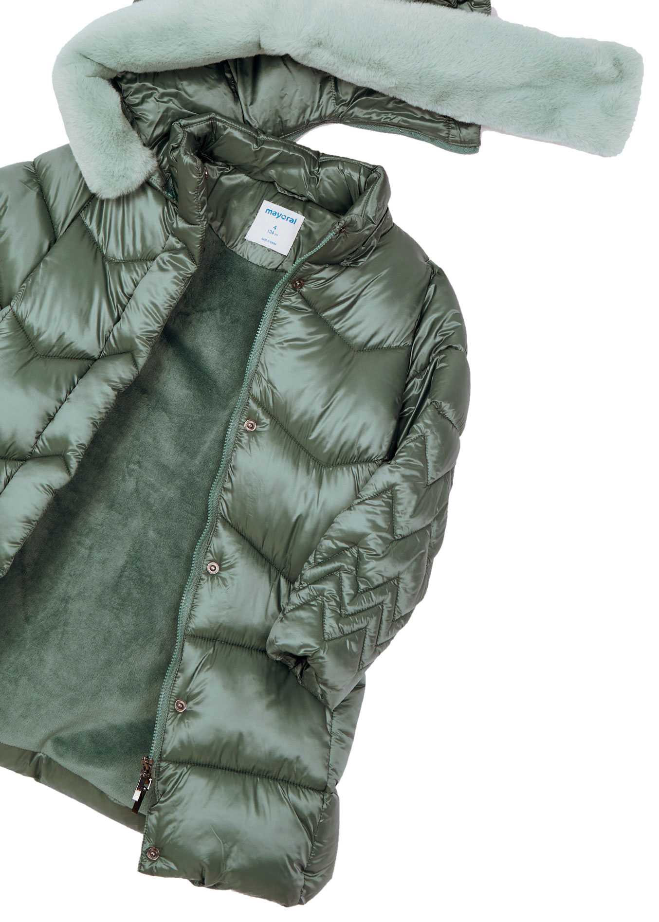 Wunderschöner Wintermantel in einem leicht schimmerndem, zarten Smaragdgrün / Lago Green Ton, mit abnehmbarer Kapuze, abnehmbaren Plüschkragen, super softem Fleecefutter innen, in leichter A-Linie geschnitten bis etwa mittig des Oberschenkels gehend, für Mädchen von MAYORAL aus Spanien.