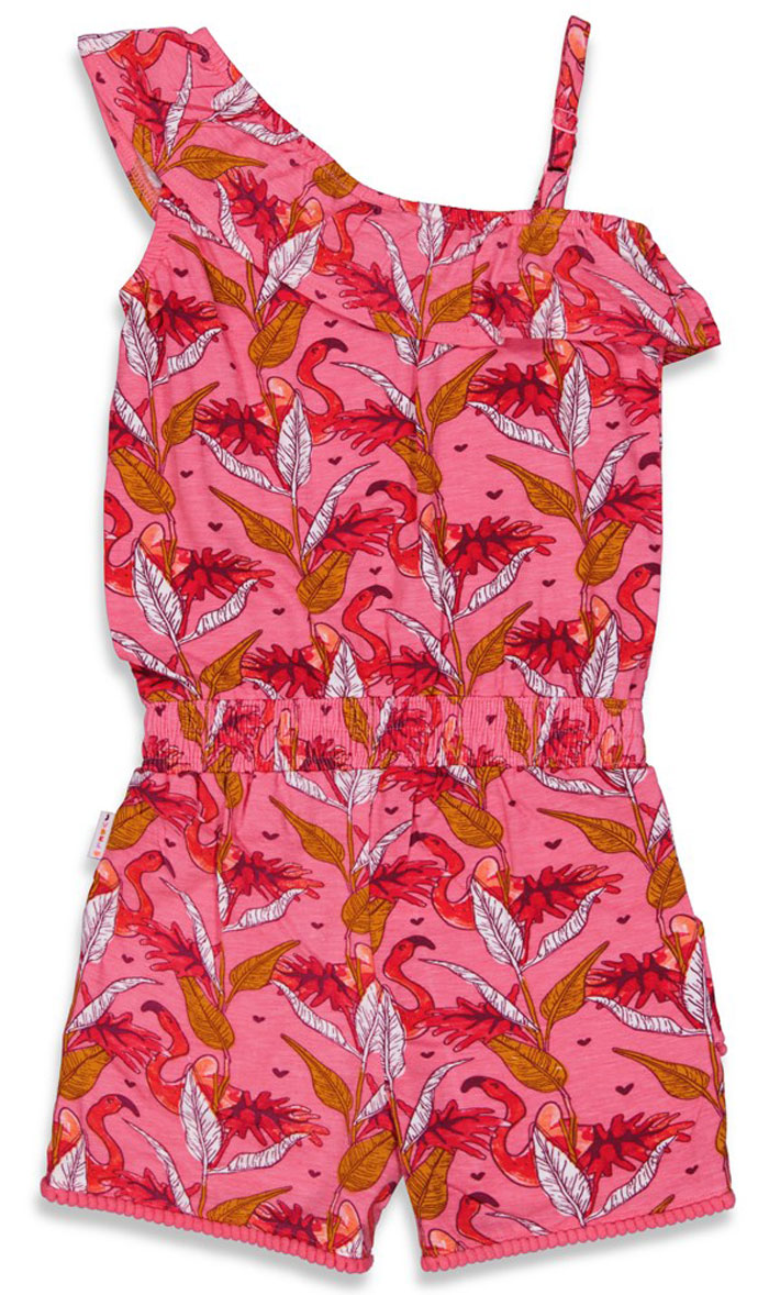 Herrlichh weicher und luftig leicht sitzender Jumpsuit mit schmalen Trägern, asymetrisch geschnitten und kurzem Bein, in einem kräftigen Pink mit sommerlichem Allover Muster, von dem niederländischen Kids Girl Label JUBEL ( der großen Schwester von FEETJE).