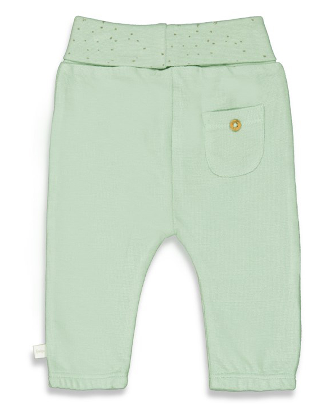 Süße, schlicht gehaltene Hose aus weichem Bio Baumwoll Frottee mit breitem Schlupfbund in einem zarten Mint Ton, für kleine Jungen und Mädchen, von dem Niederländischem Babymode Label FEETJE.