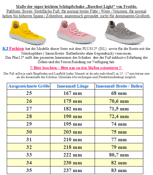 Bequemer, super leichter Barfußschuh / Sommersneaker , Turnschuh oder auch als Hausschuh prima zu tragen, aus Mesh Gewebe, leicht unterlegt zum hineinschlüpfen mit Schnürung, einer quer und längs flexiblen Gummi Grip Sohle ohne Fersenerhöhung oder Sprengung ( Zero Drop), mit einer anatomisch geformten Zehenbox für Kids von dem kroatischen Schuhhersteller FRODDO. !! KJ FASHION Tip: Bitte dringend das Bild mit den genauen Maßen je Größe beachten !! Bei Fragen gerne eine Mail an uns :-) Modell: Barefoot Light G3130262-6 Pink, helles Pink / RosaMaterial: Polyamid mit Elasthan | Innensohle: herausnehmbare Sohle: Mikrofaser, antibakteriell | Laufsohle: Lifolit®Schnitt: Leisten Breite (Standfläche Fuß - als Breite bezeichnet) Mittel bis minimal breitere Füße | Weite (beschreibt das Volumen auch als Spannhöhe bezeichnet) : normal bis etwas höher da variierbar | Mittelfuß: normal | Ferse: normal bis breit | Zehenbox: Anatomisch geformt, nicht für sehr dominanten Großzeh geeignet - leichter, bequemer Mesh Schuh mit flexibler Minimalsohle / Barfußschuhe zum hineinschlüpfen - guter Halt durch gerippten Bund und leicht zu variierender Schnürung - super zum toben in der Schule oder der Kita, zum turnen da nicht abfärbende Sohle aber auch an trockenen, warmen Tagen der perfekte leichte Barfußschuh - mit gerundeter, anatomischer Zehenbox für viel Bewegungsfreiheit - das Material aber auch die Sohle weichen sich beim tragen sehr gut Ein sportlich bequemer Schuh / Barfußschuh für den Sommer oder Aktivitäten in Räumen ( Schule / Kita z.B.) für Kids von FRODDO hergestellt in Kroatien. !! Bitte beachten - für extreme Nutzung / schleifen über Asphalt, durch Bobby Car / Laufrad etc bitte geeeignete Schutzkappen über die Schuhe ziehen - da diese dafür nicht ausgelegt sind !!