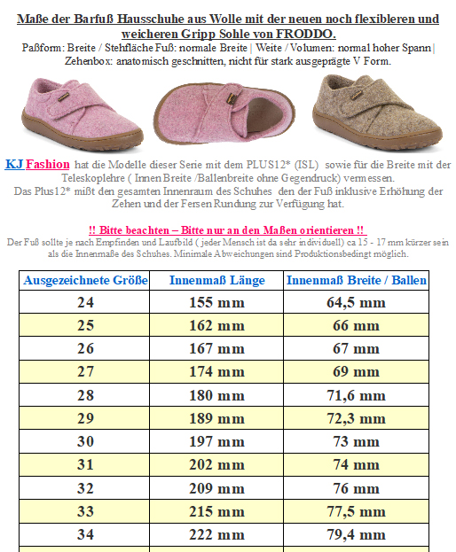 Leichter und bequemer Barfußschuh aus weicher Wolle ( Temperatur regulierend darum ganzjährig zu tragen) mit breitem Klett,, extra softer und flexibler Zero-Drop-Gummisohle und anatomischer Zehenbox – ideal als Turn- oder Hausschuh für Kinder von FRODDO Barefoot. > Bitte beachten Sie die im Bild angegebenen Maße, um unnötige Rücksendungen zu vermeiden. Bei Fragen wenden Sie sich gerne vor dem Kauf per E-Mail an uns. Ihr Team KJ Fashion! < Modell: Barefoot W. Hausschuhe aus Wolle G1700420 - 10 Pink / Rosa melangeMaterial: Wolle | herausnehmbare Sohle: mit Leder bezogen, antibakteriell | Laufsohle: GummiSchnitt: Leisten Breite (Standfläche Fuß - als Breite bezeichnet ) Mittel bis minimal breitere Füße | Weite (beschreibt das Volumen auch als Spannhöhe bezeichnet) : normal bis etwas höher da variierbar | Mittelfuß: normal | Ferse: normal | Zehenbox: Anatomisch geformt, nicht für stark ausgeprägte V Form - bequemer Hausschuh mit sehr gut flexibler Minimalsohle / Barfußschuhe für ein gutes Bodengefühl - weiche, temeraturgelierende Wolle für ein tolles Fußklima das ganze Jahr über super zu tragen - perfekt zum toben in der Schule oder der Kita, zum turnen da nicht abfärbende Sohle - mit gerundeter, anatomischer Zehenbox für viel Bewegungsfreiheit Ein weicher, bequemer Minimalschuh / Barfußschuh für trockene Tage oder Aktivitäten in Räumen ( Schule / Kita z.B.) für Kids von FRODDO hergestellt in Kroatien. !! Bitte beachten - für extreme Nutzung / schleifen über Asphalt, durch Bobby Car / Laufrad etc bitte geeeignete Schutzkappen über die Schuhe ziehen - da diese dafür nicht ausgelegt sind !!