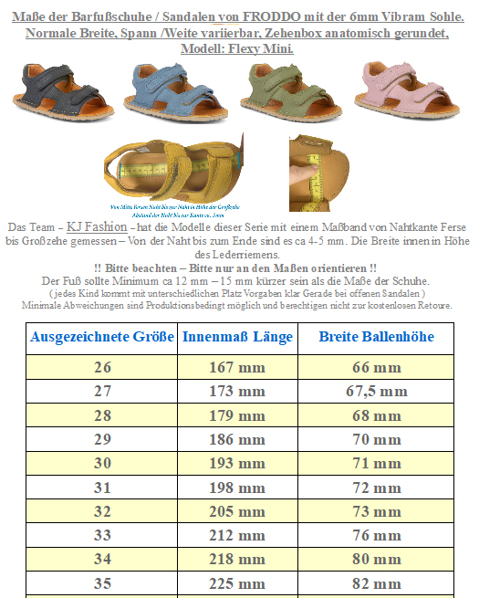 Super leichte und flexible Barfußsandale ohne Sprengung und mit Minimalsohle, aus weichem Leder LWG zertifiziert, mit zwei Klettstreifen optimal an den Fuß anzupassen, perfekt für Kids von dem kroatischen Schuhhersteller FRODDO aus der Barefoot Kollektion. > Bitte beachten Sie die im Bild angegebenen Maße, um unnötige Rücksendungen zu vermeiden. Bei Fragen wenden Sie sich gerne vor dem Kauf per E-Mail an uns. Ihr Team KJ Fashion! < Modell: Barefoot Flexy G3150283-11 Coral GlitzerMaterial: Nappaleder | Innen: Leder | Laufsohle: Vibram Sohle ( um einem normalen, kindlichen Abrieb stand zu halten mit einer Gesamtdicke inklusive des Lederbezuges von 7-8 mm )Paßform: Breite (Standfläche Fuß) Mittel | Weite ( beschreibt das Volumen auch als Spannhöhe bezeichnet) : normal bis etwas höher da variierbar | Mittelfuß: normal | Ferse: normal | Zehenbox: Anatomisch geformt, nicht für stark dominanten Großzeh - super flexible Sandale mit Fersen und Zehenschutzt auf einer robusten aber flexiblen Minimalsohle mit Leder bezogen - weiches Leder, Fersenbereich innen abgepolstert, innen komplett aus weichem Glattleder - zwei breite Klettriegel zum variieren und eine optimale Anpassung an den Fuß des Kindes - breite Zehenbox, ergonomische Form für ein optimales Laufgefühl und Platz für die Zehen - ganz weiche, quer und längs flexible Sohle, diese weicht sich beim tragen noch mehr ! Da Kinder Schuhe gut tragen - was super ist und so sein sollte - benötigt das Material einer Sohle eine gewisse Stärke um dem normalen Abrieb standzuhalten ! Ein sportlich bequemer Barfußschuh für den Sommer für Kids von FRODDO hergestellt in Kroatien. !! Bitte probiert Schuhe aus hygienischen Gründen immer mit sauberen Söckchen an (Sporen und Schweiß haften so weniger bis gar nicht im Schuh) / Nicht geeignet zum Rutscheauto / Laufrad fahren, schleifen über dem Boden reibt die dünnen Sohlen kaputt !!
