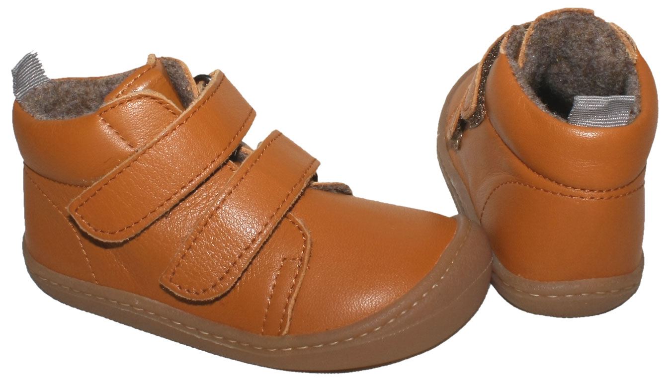 Der optimale Schuh für den Übergangs und leicht kühlere Tage, ein klassischer Halbschuh mit leicht erhöhtem Schaft, mit zwei Klettstreifen zu schließen und innen mit kurzem Wollfilz gefüttert, in einem warmen Honig Ton von KOEL 4 KIDS aus den Niederlanden.