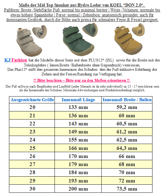 Super weiche, absolut flexible Barfußschuhe - Halbschuhe in minimal höherer Form ( optimal bei schmaler Fessel) mit Klett aus weichem Kalbsleder / Nubukleder, innen mit Glattleder ausgelegt, Innensohle herausnehmbar, in der etwas breiteren Leiste ( verglichen mit dem B. Modellen von KOEL ) mit minimal verstellbarer Spannhöhe ( Weite) von KOEL 4 KIDS aus der Barfußschuh Linie. !!Bitte beachten sie die als Bild hinterlegte Tabelle zum messen der Schuhgröße, um so ein unnötiges hin und her senden zu vermeiden - bei Fragen mailen Sie uns einfach vor dem Kauf an - Ihr Team KJ Fashion !! Modell: Don 2.0 Nubuk in Cognac / Curry Gelb- 07M002.121-550Material: Nubukleder / sanft, mattes Finish | Innen: Glattleder | Sohle: GummiWeite (diese bezieht sich auf das Volumen im Schuh) M - also für normal hohen bis minimal höheren Spann geeignet | Leiste (Stehfläche Fuß) normal bis etwas breiter | Mittelfuß: normal bis etwas breiter | Ferse: normal | Zehenbox: anatomisch gerundet geformt - Halbschuh in seitlich minimal höherer Form - abgepolsterter Einstieg, innen mit weichem Glattleder ausgelegt - mit zwei Klettstreifen zu öffnen, optimal an den Fuß anzupassen und so auch super im Umfang / der Spannhöhe zu regulieren - herausnehmbare, weiche, mit Leder bezogene Sohle - weiche, flexible Gummisohle mit Minimalprofil - an der Spitze im Zehenbereich ist die Sohle etwas hochgezogen als Schutzkante - super weich und flexibel, das Material weicht sich noch mehr beim tragen der Schuhe Der optimale Schuh für den Übergang für Kinder von KOEL Barefoot.