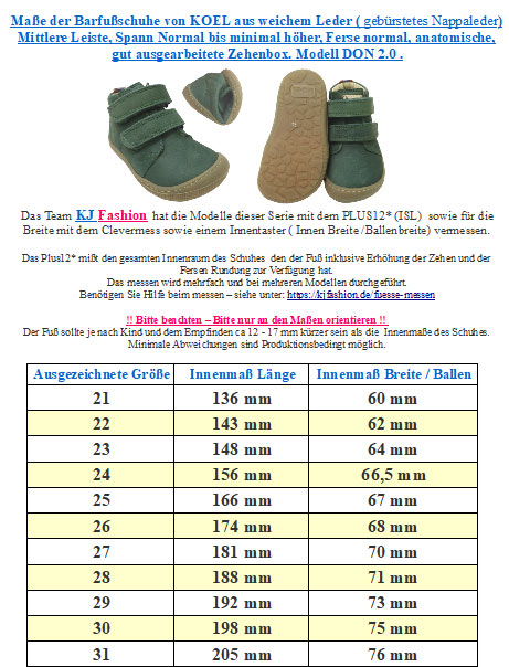Super weiche, absolut flexible Barfußschuhe - Halbschuhe in Mid Top Höhe bis knapp auf dem Gelenkknöchel endend ( optimal bei schmaler Fessel) mit Klett aus weichem Hydrophobiertem Leder, innen mit Glattleder ausgelegt, Innensohle herausnehmbar, auf dem etwas breiteren Leisten ( verglichen mit den Klassik / B. Modellen von KOEL ) mit minimal verstellbarer Spannhöhe ( Weite) von KOEL Barefoot. !!Bitte beachten sie die als Bild hinterlegte Tabelle zum messen der Schuhgröße, um so ein unnötiges hin und her senden zu vermeiden - bei Fragen mailen Sie uns einfach vor dem Kauf an - Ihr Team KJ Fashion !! Modell: Don 2.0 in mattem Oliv 07M002.121-360Material: Hydrophobiertes Leder / sanft, mattes Finish | Innen: Glattleder | Sohle: GummiWeite (diese bezieht sich auf das Volumen im Schuh) M - also für normal hohen bis minimal höheren Spann geeignet | Leiste (Stehfläche Fuß) normal bis etwas breiter | Mittelfuß: normal bis etwas breiter | Ferse: normal | Zehenbox: anatomisch gerundet geformt - Halbschuh in seitlich minimal höherer Form, Mid Top - abgepolsterter Einstieg, innen mit weichem Glattleder ausgelegt - mit zwei Klettstreifen zu öffnen, optimal an den Fuß anzupassen und so auch super im Umfang / der Spannhöhe zu regulieren - herausnehmbare, weiche, mit Leder bezogene Sohle - weiche, flexible Gummisohle mit Minimalprofil - an der Spitze im Zehenbereich ist die Sohle etwas hochgezogen als Schutzkante - super weich und flexibel, das Material weicht sich noch mehr beim tragen der Schuhe Der optimale Schuh für den Übergang für Kinder von KOEL Barefoot. !! Bitte beachten - für extreme Nutzung durch Bobby Car / Laufrad etc bitte geeeignete Schutzkappen über die Schuhe ziehen - da diese dafür nicht ausgelegt sind !!