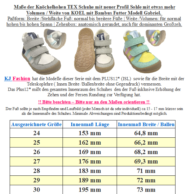 Robuste Barfußschuhe mit Tex Membran in halbhoher Form aus Leder, mit Glitzerfolie verziert, mit Doppelklett zu öffnen, innen mit warm haltendem, nicht zu dickem Wollfilz Futter gearbeitet, minimal quer und längs flexible Gummigrippsohle auf dem Extra breiten Leisten, mit etwas mehr Volumen im Spann Bereich ( Weite) von KOEL Barefoot. > Bitte beachten Sie die im Bild angegebenen Maße, um unnötige Rücksendungen zu vermeiden. Bei Fragen wenden Sie sich gerne vor dem Kauf per E-Mail an uns. Ihr Team KJ Fashion! < Modell: KALI Suede 15T007.305-640 ChampagneMaterial: Suede Leder und Glattleder Mix - stark Wasserabweisend dank Tex Membran zwischen den beiden Schichten | Innen: Merinowolle gefilzt | Sohle: GummiWeite ( diese bezieht sich auf das Volumen ) für einen mittleren bis höheren Spann geeignet | Leisten -Breite (Stehfläche Fuß) breit | Mittelfuß: etwas breiter | Ferse: normal bis etwas breiter | Zehenbox: anatomisch gerundet geformt - Barfußschuhe für kühlere Tage, in halbhoher Form bis über den Gelenkknöchel hinaus gehend - abgepolsterter Einstieg, innen mit weichem nicht zu dickem Wollfilz ausgelegt, zwischen den beiden Materialien mit einer Tex Membran gearbeitet ( Bitte beachten das Tex Membran nur funktionieren wenn es außen kälter als im Schuh ist, und diese GUT durchtrocknen kann ) - mit zwei breiten Klettstreifen zu öffnen, optimal an den Fuß anzupassen - herausnehmbare, mit Wollfilz bezogene Innensohle - flexible Gummisohle mit gutem Gripp Profil, durch das Futter sowie die TEX Membran ist die Sohle weniger knautschig weich als Modelle ohne Futter und ohne Tex - an der Spitze im Zehenbereich ist die Sohle hochgezogen als Schutzkante Der optimale Schuh für den milden Winter und den Übergang von KOEL Barefoot. !! Bitte beachten - für extreme Nutzung durch Bobby Car / Laufrad / krabbeln mit der Spitze etc bitte geeeignete Schutzkappen über die Schuhe ziehen - da diese dafür nicht ausgelegt sind !! !! TIP bei kalten Füßen - tragen sie am besten Socken die nicht zu eng am Fuß sitzen aus Wolle, da diese sich am Fuß des Kindes nicht so schnell feucht und sich damit kalt anfühlen wie eine Socke aus Baumwolle - auch Funktionssocken leiten die Feuchtigkeit des Fußes hervorragend ab, so das das Kind nicht so schnell kalte Füße durch feuchte Socken bekommt -> Hier geht es zu unseren Woll und Funktionssocken <