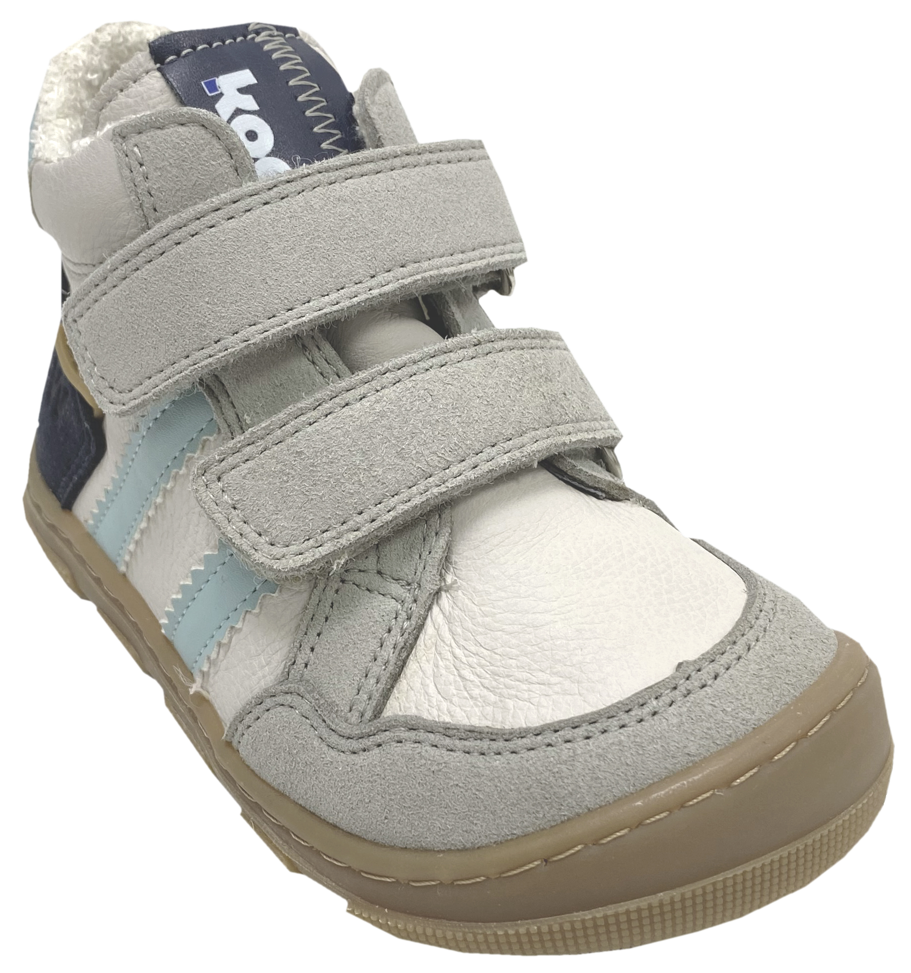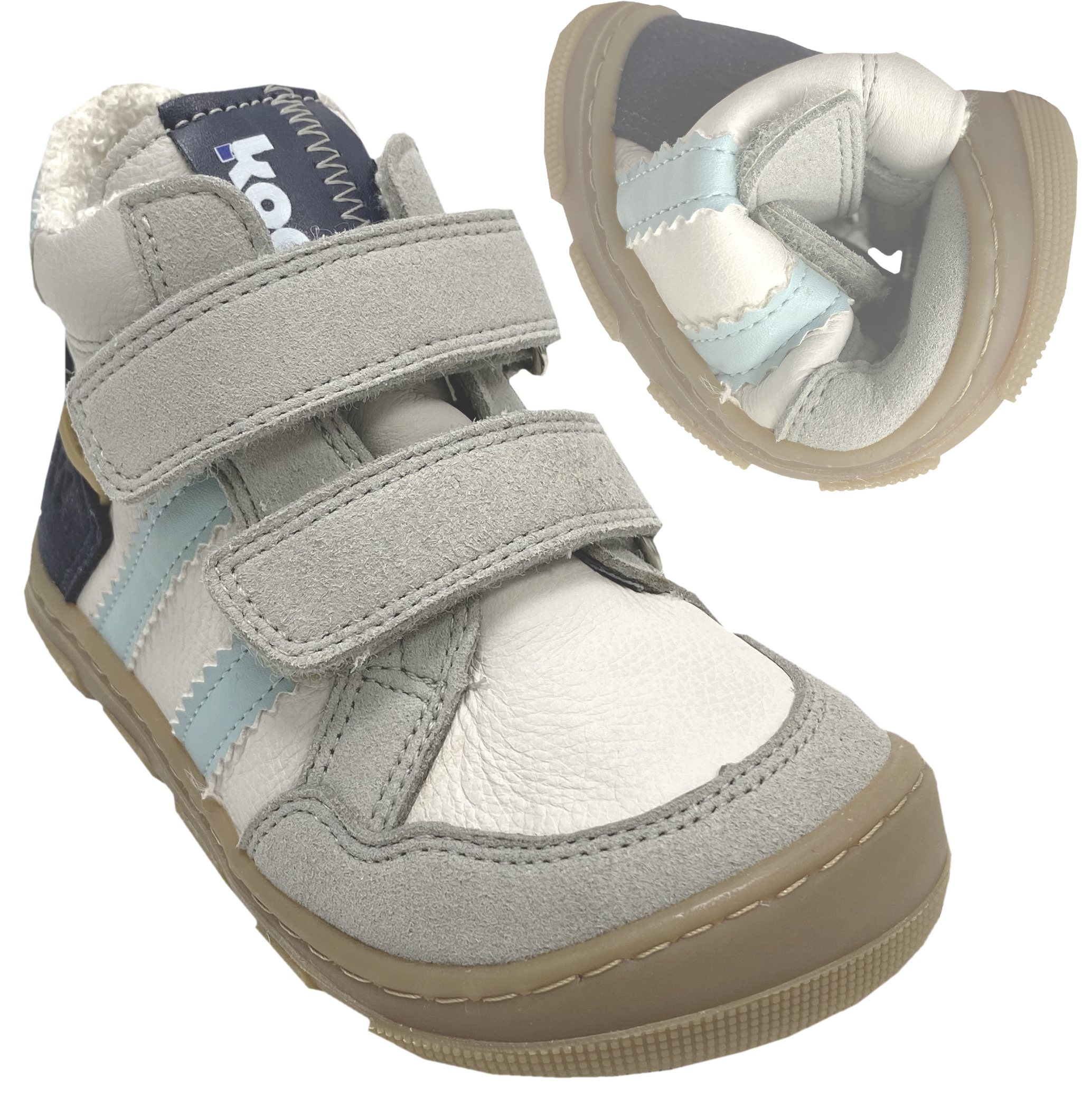 Trendige Barfußschuhe für den Übergang aus Nappaleder mit Nubukleder Besatz, darunter mit einer Tex Membran, innen mit weichem Bambus ausgelegt für optimales Fußklima, bis gut über den Gelenkknöchel gehend, flexibler Gummisohle mit gutem Profil, auf dem etwas breiteren Leisten ( verglichen mit den B / Klassik Modellen von KOEL ) optimal für Kids von KOEL Barefoot.