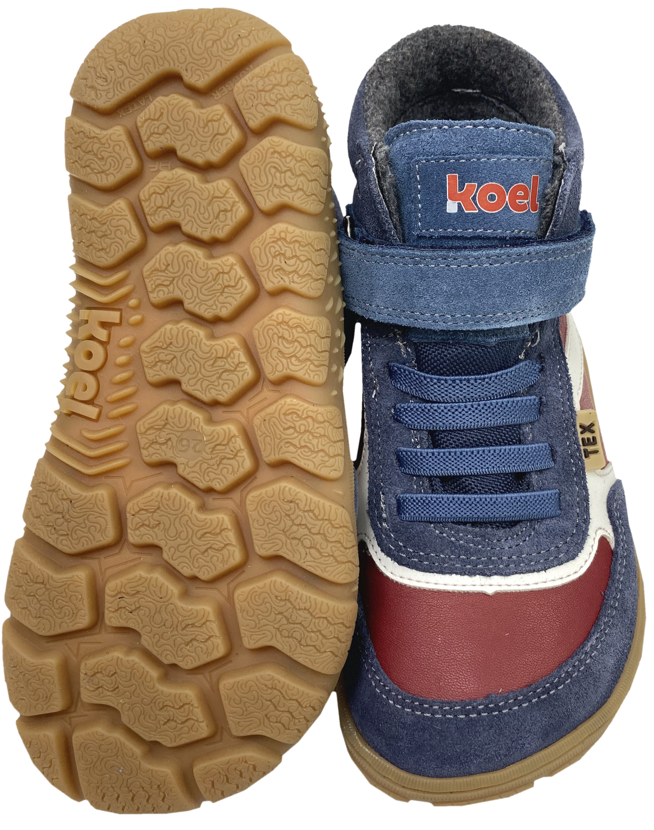 Die lässig-coolen knöchelhohen Barfußschuhe Daniel 2.0 von KOEL Barefoot sind ideale Begleiter für den Übergang und milden Winter: aus hydrophobiertem Leder mit Tex Membran, leichtem Merino-Wollfilzfutter, flexibler Minimalsohle auf dem etwas breiterem Leisten / verglichen mit der Klassik Linie von KOEL Barefoot. > Schuhe mit Tex Membran + Futter sind durch das mehr an Material immer etwas "fester" und "schwerer" als ein Sommerschuh, da das mehr an Material ein Eigengewicht und auch eine gewisse Dichte hat. < > Bitte beachten Sie die im Bild angegebenen Maße, um unnötige Rücksendungen zu vermeiden. Bei Fragen wenden Sie sich gerne vor dem Kauf per E-Mail an uns. Ihr Team KJ Fashion! < Modell: Daniel 2.0 Felt TEX 07T054.123 - 550 Cognac / KobaltblauMaterial: Leder mit weicher, matter Haptik, Tex Membran | Innen: Schurwolle, Wollfilzfutter mulesing frei | Sohle: Gummi | Paßform: Weite ( diese bezieht sich auf das Volumen ) M - also für normal hohen bis minimal höheren Spann geeignet | Leisten (Stehfläche Fuß) normal bis minimal breiter | Mittelfuß: normal | Ferse: normal | Zehenbox: anatomisch gerundet - Kinderschuh / Barfußschuhe für den Übergang, bis über den Knöchel gehend, so das Kälte und Matsch nicht ganz so schnell hindurch kommt - abgepolsterter Einstieg, innen mit weichem nicht zu dickem Wollfilz ausgelegt, zwischen dem Außen und dem Innenmaterial mit einer Tex Membran versehen - mit einer Zier Elastikschnürung über dem Mittelfuß, diese gibt dem Schuh den Halt am Fuß zu bleiben, um die Fessel dann ein breiter Klett - herausnehmbare, weiche, mit Wollfilz bezogene Sohle, wird diese herausgenommen wird es noch weicher und flexibler - flexible Gummisohle mit gutem Gripp dank des Puzzle Profils - hochgezogene Sohle als Schutzkante Der optimale Schuh für den Übergang und einen milden Winter - ein hochwertig verarbeiteter Schuh in cooler, sportlicher Optik von KOEL. !! TIP bei kalten Füßen - tragen sie am besten Socken die nicht zu eng am Fuß sitzen aus Wolle, da diese sich am Fuß des Kindes nicht so schnell feucht und sich damit kalt anfühlen wie eine Socke aus Baumwolle - auch Funktionssocken leiten die Feuchtigkeit des Fußes hervorragend ab, so das das Kind nicht so schnell kalte Füße durch feuchte Socken bekommt -> Hier geht es zu unseren Woll und Funktionssocken <
