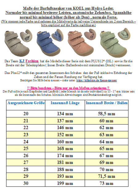 Super weiche, absolut flexible Barfußschuhe - Halbschuhe in minimal höherer Form mit Klett, aus weichem hydrophobiertem Leder, gebürstet in dunklem Altrosa / Blossom Ton, innen mit weichem Wollfilz ( Schurwolle Mulesingfrei ) ausgelegt, Innensohle herausnehmbar, in der schmaleren Leiste ( verglichen mit den D Modellen von KOEL ) mit normaler etwas flacherer und verstellbarer Spannhöhe ( Weite) von KOEL Barefoot. !!Bitte beachten sie die als Bild hinterlegte Tabelle zum messen der Schuhgröße, um so ein unnötiges hin und her senden zu vermeiden - bei Fragen mailen Sie uns einfach vor dem Kauf an - Ihr Team KJ Fashion !! Modell: BOB Hydro 06W002.233- 600 Blossom dunkler, gedeckter Altrosa TonMaterial: gebürstetes Napa Leder / matt weiches Finish | Innen: Schurwolle gefilzt | Sohle: GummiWeite (diese bezieht sich auf das Volumen im Schuh) M - S also für normal hohen bis etwas flacher werdenden Spann geeignet  |  Leiste (Stehfläche Fuß) normal bis schmal | Mittelfuß: normal bis etwas schmaler | Ferse: normal  | Zehenbox:  gerundet geformt - Halbschuh in seitlich minimal höherer Form  - abgepolsterter Einstieg, innen mit Wollfilz ausgelegt, perfekt für den Übergang und milde Winter ( je nach Kälte Empfinden des Kindes ) - mit zwei Klettstreifen zu regulieren und so gut an den Fuß anzupassen - herausnehmbare, weiche, mit Wollfilz bezogene Innensohle - weiche, flexible Gummisohle mit Minimalprofil, Nullabsatz und keinerlei Erhöhungen im Mittelfuß oder der Ferse - an der Spitze im Zehenbereich ist die Sohle etwas hochgezogen als Schutzkante - super weich und flexibel, das Material weicht sich noch mehr beim tragen der Schuhe Der optimale Schuh für den Übergang für Kinder von KOEL Barefoot.