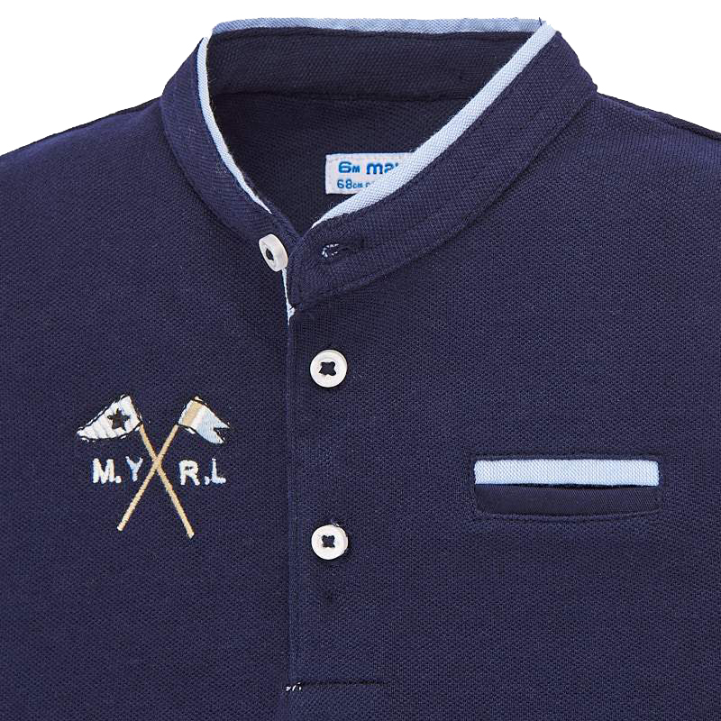 Sportlich schickes T - Shirt in Pique Qualität, mit kurzem Arm in einem tief dunklem Marine Blau mit Hellblauer Einfassung am Kragen aus weichem Chambray und einem wertigen Logo Stick auf der Seite, für kleine Jungen von MAYORAL aus Spanien.