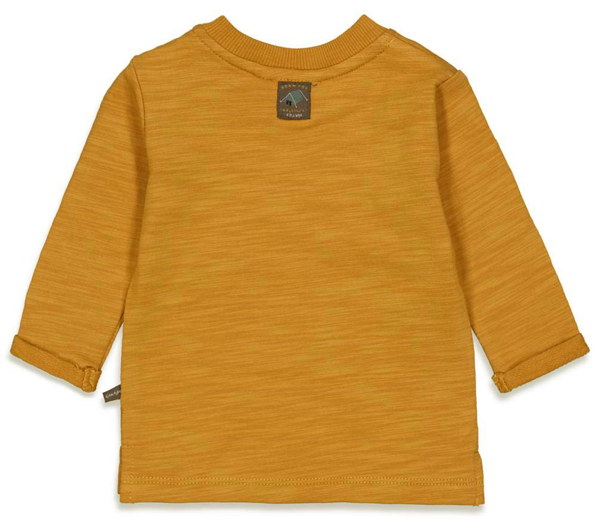 Schickes Langarmshirt in ienem gedeckten Ockergelb, aus etwas dichter gewebtem French Terry / Sommersweat, ungefüttert, aus weicher Bio Baumwolle mit Spruch Print und Stick auf der Front, für kleine Kids von dem Niederländischem Babymode Label FEETJE.
