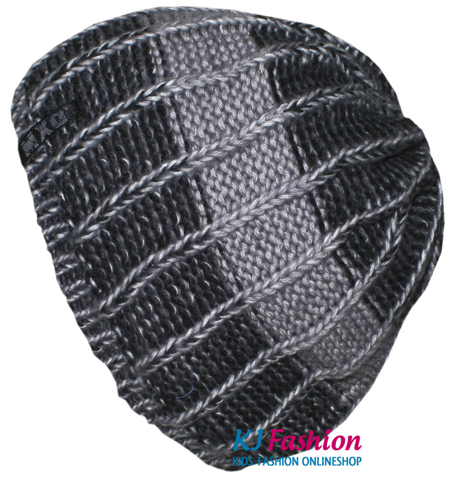 Coole Topfmütze für die kalten Tage aus Grobstrick in 2 Grau Tönen versetzt gestreift mit weichem Baumwoll Jerseyfutter für Jungen von dem Mützenprofi MAXIMO made in Germany.