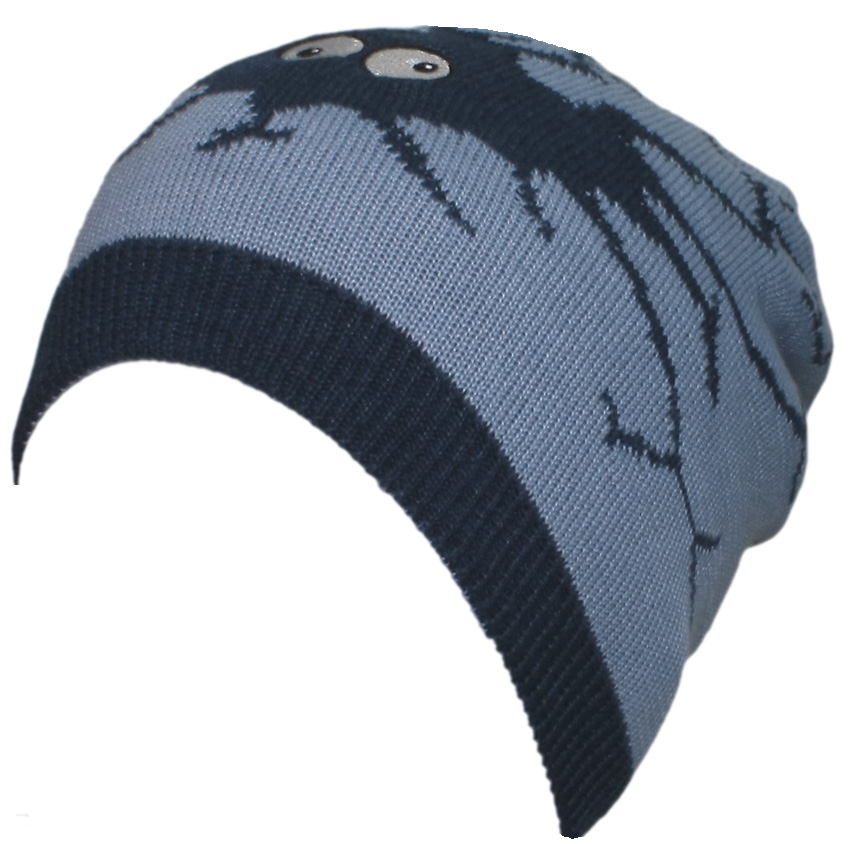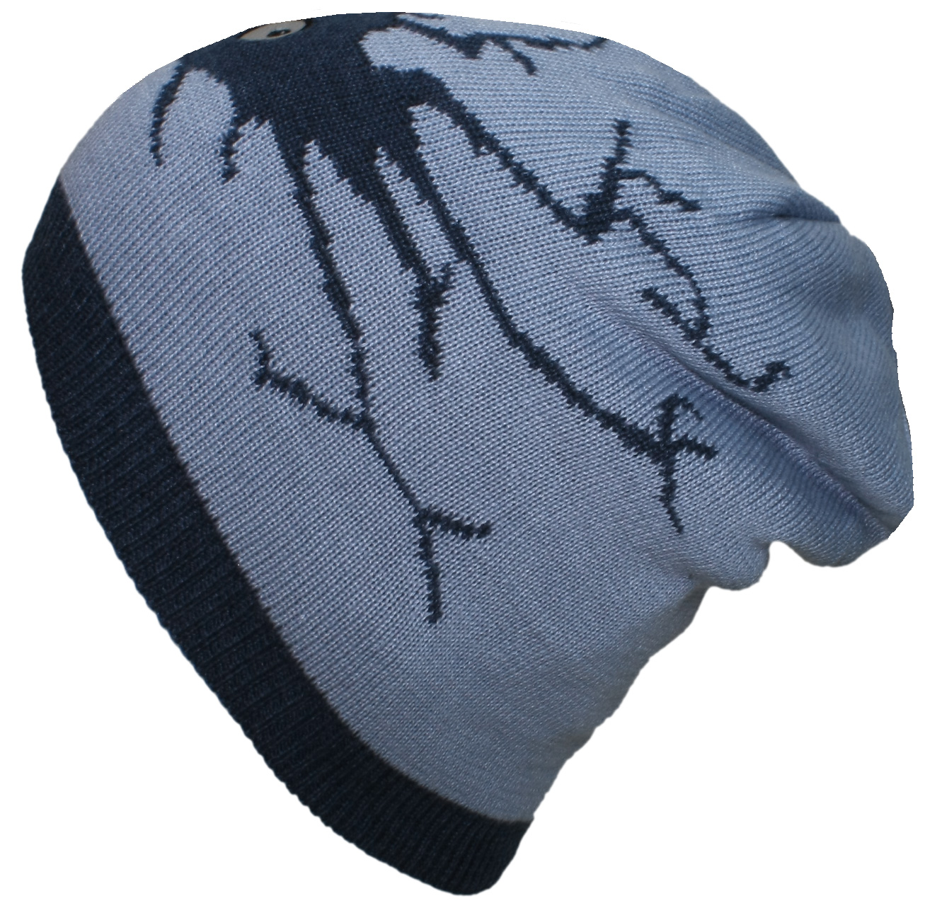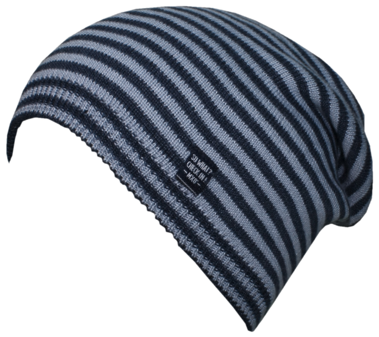 Cooles Strickbeanie / Strickmütze aus doppeltem Feinstrick in einem gedeckten Denim Blau Ton mit frechem Monster auf der Front - Wendeseite in schmalen Ringeln in Dunklem und hellem Jeansblau gehalten von dem Mützenprofi MAXIMO made in Germany.