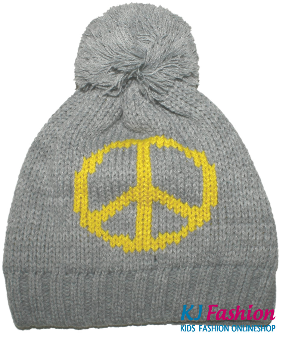 Trendige Grobstrickmütze mit Fleecebesatz im unteren Bereich in einem hellen Grau Ton mit großem gelben Peace Zeichen eingestrickt von DÖLL.