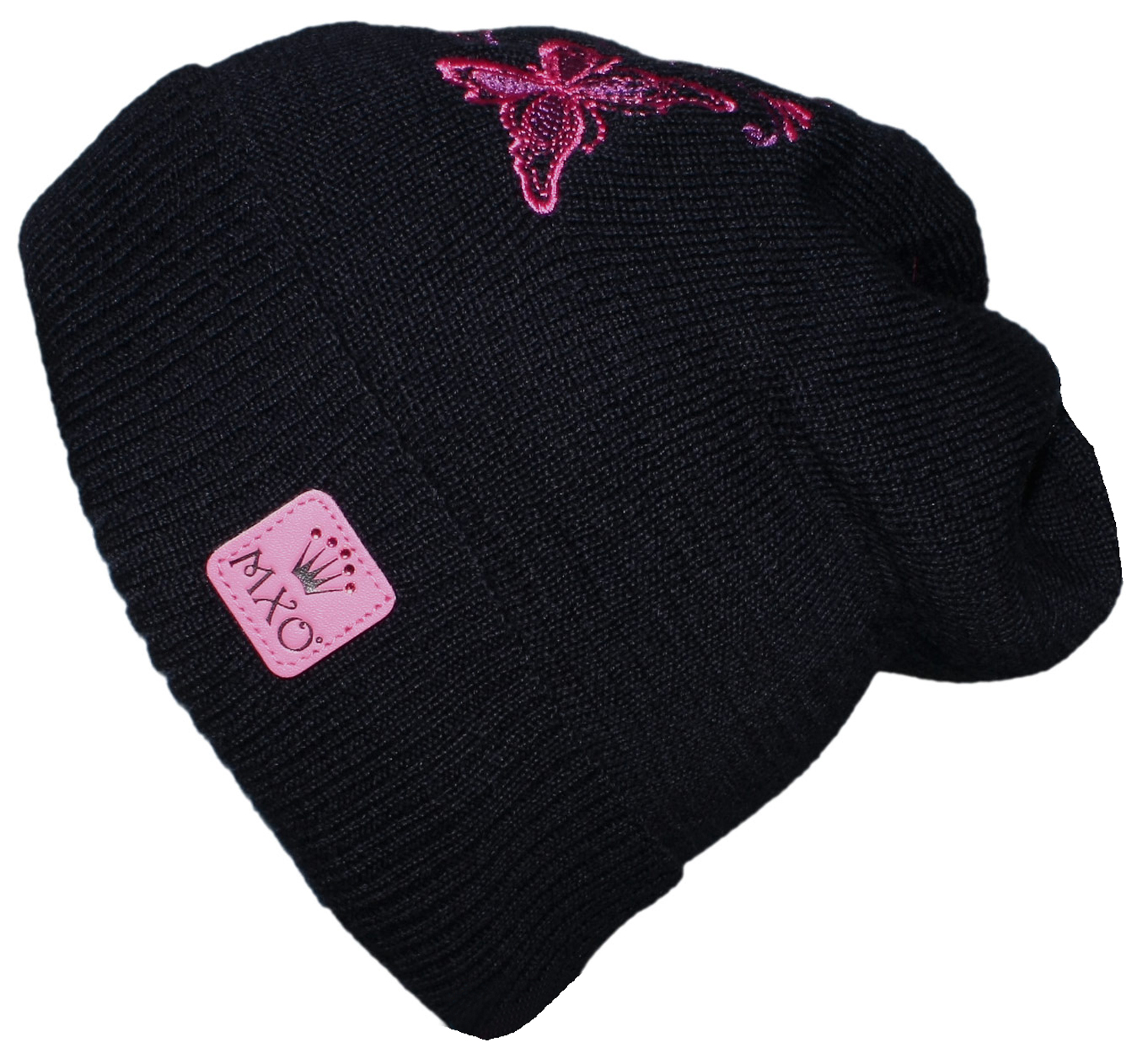 Schicke und richtig warm haltende Strickmütze in knapper Short Beanie Form, aus Woll Mix mit dickem Fleecefutter, in einem tief dunklem Navy Blau Ton mit wertigem Schmetterlingsstick in Pink Tönen von dem Mützenprofi MAXIMO made in Germany.