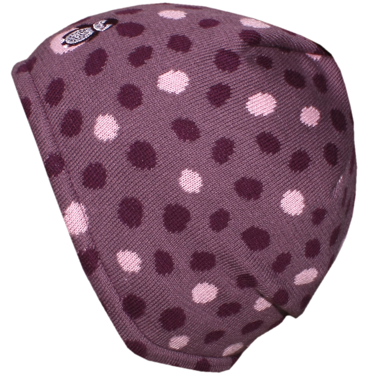 Niedliche, schicke Wintermütze aus Violett / Lila farbendem Feinstrick mit Ton in Ton gehaltenen Punkten, weichem Baumwollfleece Futter innen komplett ausgelegt, Ohrenausarbeitung und kleinem Pinguin Stick auf der Front für kleine Mädchen von dem Mützenspezialisten aus Chemnitz MAXIMO.