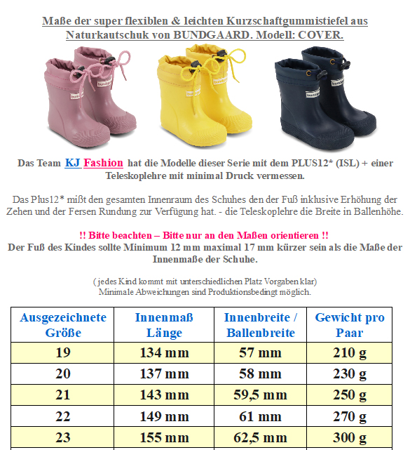 Super weicher und flexibler Kurzschaft Gummistiefel für die kleinsten Läufer, zum ausgelassenen Pfützenspringen, aus richtig leichtem, knautschbarem Kautschuk mit anatomischer, breiter Zehenbox, Nullabsatz, Verstärkung als Schutz auf dem Zehenbereich und seitlich als Umrandung von BUNDGAARD mit dem Modell COVER. !!Bitte beachten sie die als Bild hinterlegte Tabelle mit den Maßen um so ein unnötiges hin und her senden zu vermeiden - bei Fragen mailen Sie uns einfach vor dem Kauf an - Ihr Team KJ Fashion !! Modell: Cover BG401040 fb 501 NavyMaterial: 100% Kautschuk , Innen: 65% Baumwolle, 35% Dacron, dünnes Textilfutter ( KEIN Winterfutter )Weite (diese bezieht sich auf das Volumen) M bis W - also für normal bis etwas höheren Spann - generell wird die Barefoot Linie von Bundgaard mit dem "Fit: Wide" ausgezeichnet | Leiste (Stehfläche Fuß) Normal bis breit | Mittelfuß: normal bis ins Breite gehend | Ferse: normal | Zehenbox: gerundet, anatomische FormPflegehinweis für Naturkautschuk-Schuhe: Bitte nicht direkter Wärme, starker Sonneneinstrahlung oder aggressiven Reinigungsmitteln aussetzen – das Material kann sonst austrocknen und porös werden. Zur Pflege empfehlen wir spezielle Gummipflegeprodukte. Das weiche, flexible Material ist nicht für dauerhaftes Laufen, Rutschfahrzeuge oder Schleifen über Asphalt geeignet – hierfür bitte festes Schuhwerk verwenden. - perfekt für Matschwetter und Regentage sind die Barfußgummistiefel für kleine Kids - kurzer Schaft mit einer Stulpe zum regulieren, für eine gute Paßform - dünnes textiles Futter für ein angenehmes Tragegefühl - schöne anatomisch geformte Zehenbox und super weiches Material für ein ungehindertes freies laufen und ein optimales Bodengefühl - herausnehmbare, textile Innensohle - außen an der Ferse mit einem reflektierendem Streifen versehen - gutes Profil und geribbelter Besatz seitlich und auf der Zehenbox Ein super weicher, flexibler und leichter Gummistiefel für kleine Kinder von BUNDGAARD. !! Wichtiger Hinweis für die weichen Naturgummistiefel für eine lange Lebensdauer: !!wenn Sie Ihre Gummistiefel lange nutzen möchten, ist ein optimaler Sitz wichtig. Da Gummistiefel nicht verstellbar sind, kann ein unpassender Sitz zu erhöhtem Abrieb oder Materialbruch führen. Hier sind einige Tipps, die Ihnen helfen könnten, sicherzustellen, dass Ihre Gummistiefel fest am Fuß sitzen: Verwenden Sie eine zusätzliche Einlegesohle, um dem Fuß mehr Volumen zu geben. Tragen Sie eine Stulpe, um den Waden mehr Volumen zu verleihen. Bringen Sie ein Silikonpad in die Fersenhöhe im Schuh an, um ein zu schnelles Herausrutschen zu vermeiden. Stecken Sie die Hose oder Regenhose in die Stiefel, um den Schaft etwas mehr auszufüllen. Ein zu locker sitzender Stiefel kann dazu führen, dass die Ferse stark über den Boden schleift und die Sohle übermäßig beansprucht wird. Falls Sie weitere Fragen haben, zögern Sie nicht, uns eine E-Mail zu schreiben – das KJ FashionTeam steht Ihnen gerne beratend zur Seite.