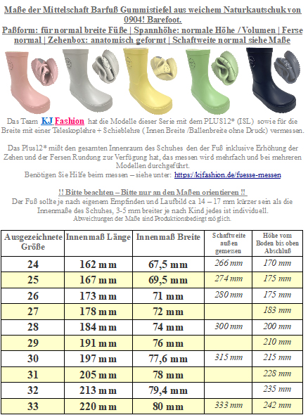 Super weicher und flexibler Gummistiefel in klassischer Mittelschafthöhe ohne störende Stulpe mit anatomisch geformter Zehenbox ( Fußform ) zum ausgelassenen Pfützenspringen, keiner Erhöhung in der Sohle, mit super quer und längs flexibler Barfußsohle von dem neuen Label 0904! Barefoot.