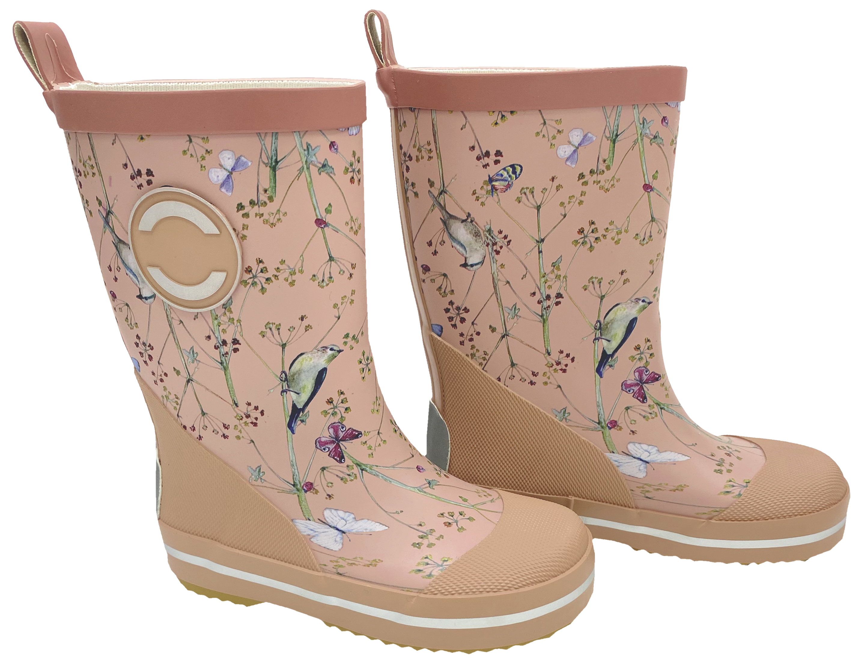 Modell: 38055 Warm Taupe matte Pastell Töne mit floralem Muster & Schmetterlingen / Vögeln Allover ( Gummistiefel auf der Mikk Line Barfußsohle - Herstellerangabe )