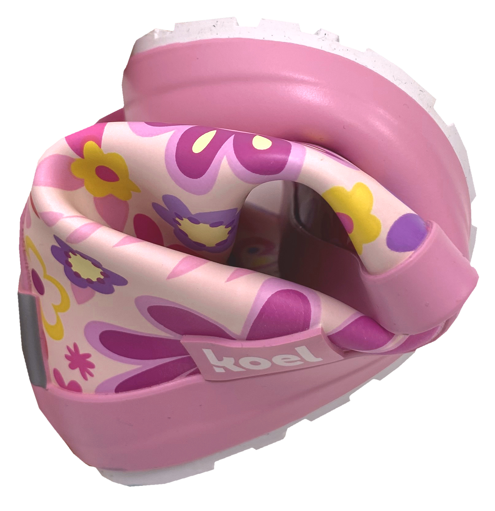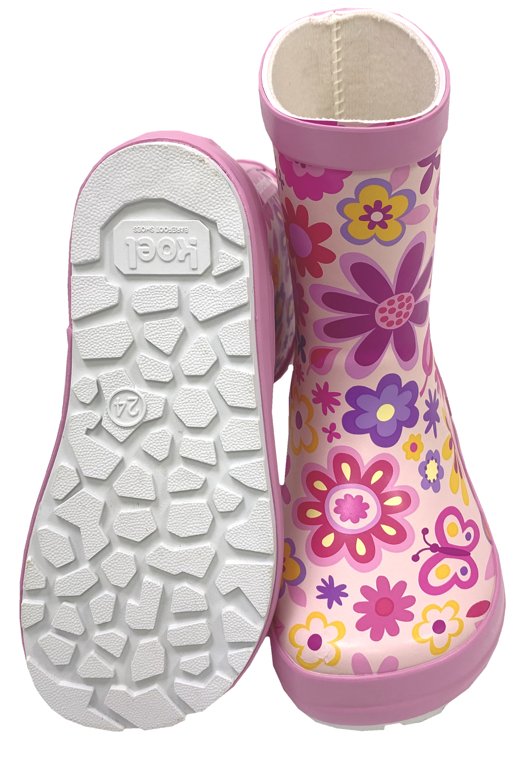 Super weicher und flexibler Gummistiefel / Barfußschuhe zum ausgelassenen Pfützenspringen, aus weichem Gummi in Pink mit bunten Blüten Allover, breiter, anatomischer Zehenbox, keiner Erhöhung in der Sohle, Nullabsatz, super quer und längs flexibler Barfußsohle von KOEL Barefoot.