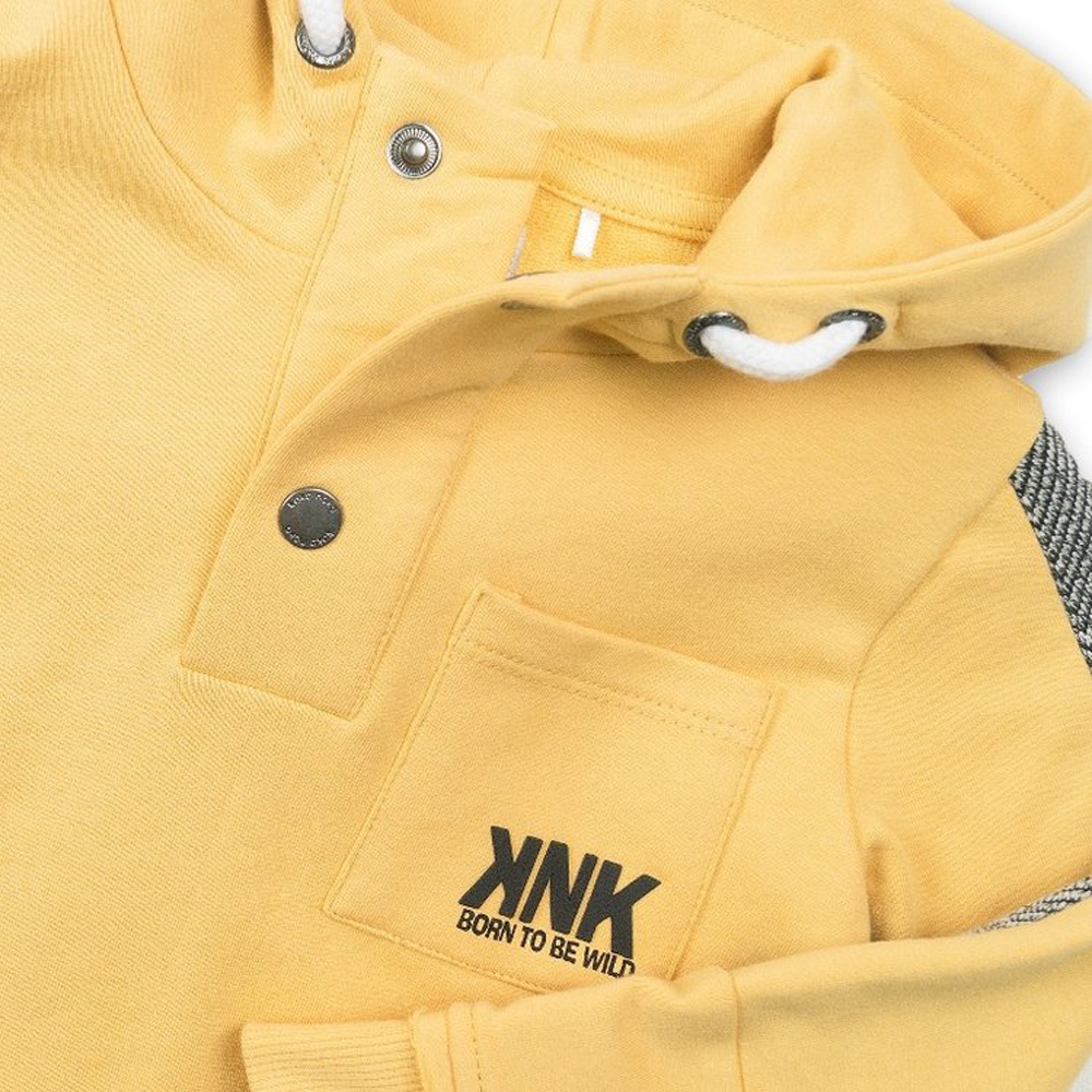 Lässig cooler Kapuzensweater in Sonnengelb aus weichem Baumwoll Jersey in French Terry Qualität, ungefüttert mit schmalem Besatz aus Grau / Anthrazit farbendem Chevron Strickmuster am Ärmel für kleine Jungen von dem Niederländischem Babymode und Kindermode Label KoKo NoKo ( Van Gennip Group)