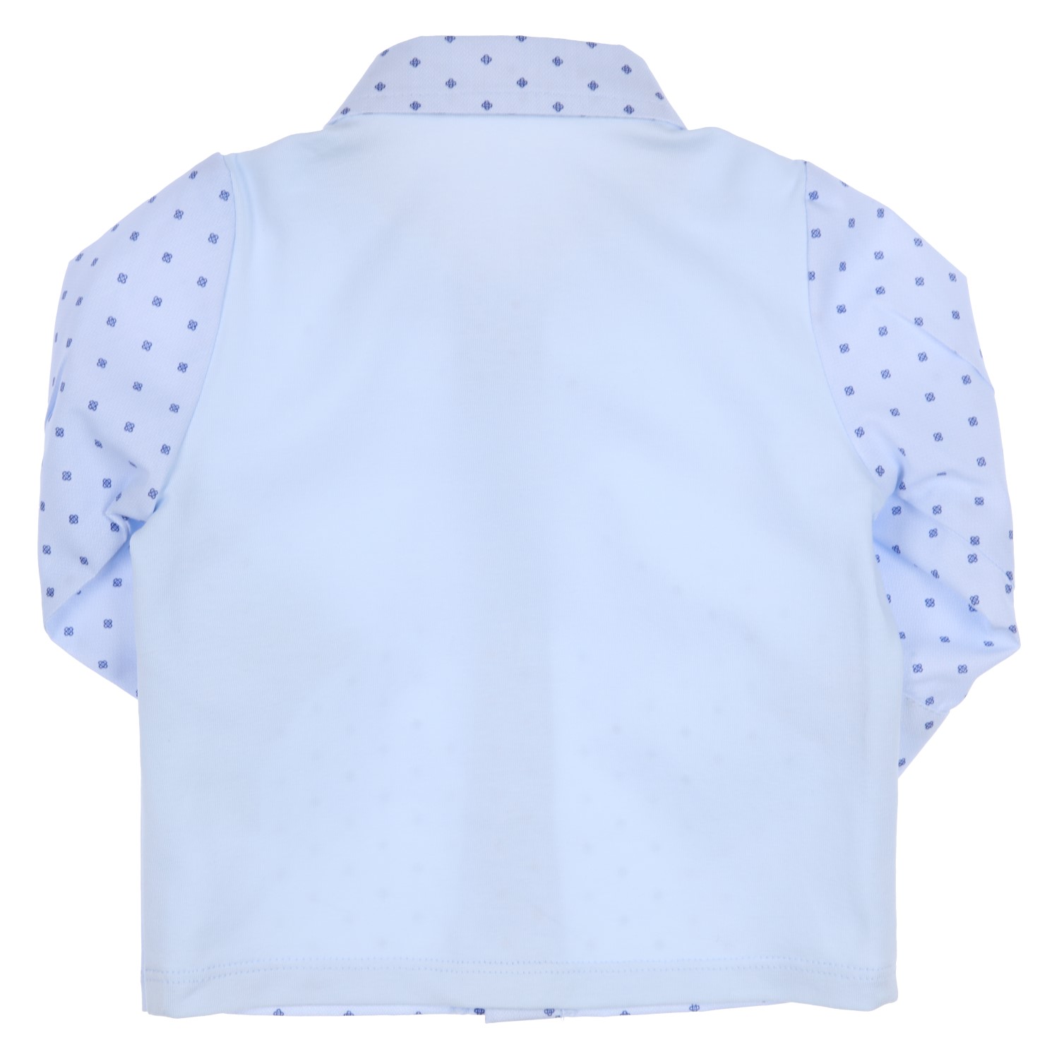 Schickes Hemd für kleine Jungen in Weiß mit kleinen geteilten Ovalen in Hellblau / Dunkel gemustert, mit weißem Rücken aus weichem Jersey aus reiner Baumwolle, perfekt für einen besonderen Tag, von dem belgischen Familienunternehmen GYMP.