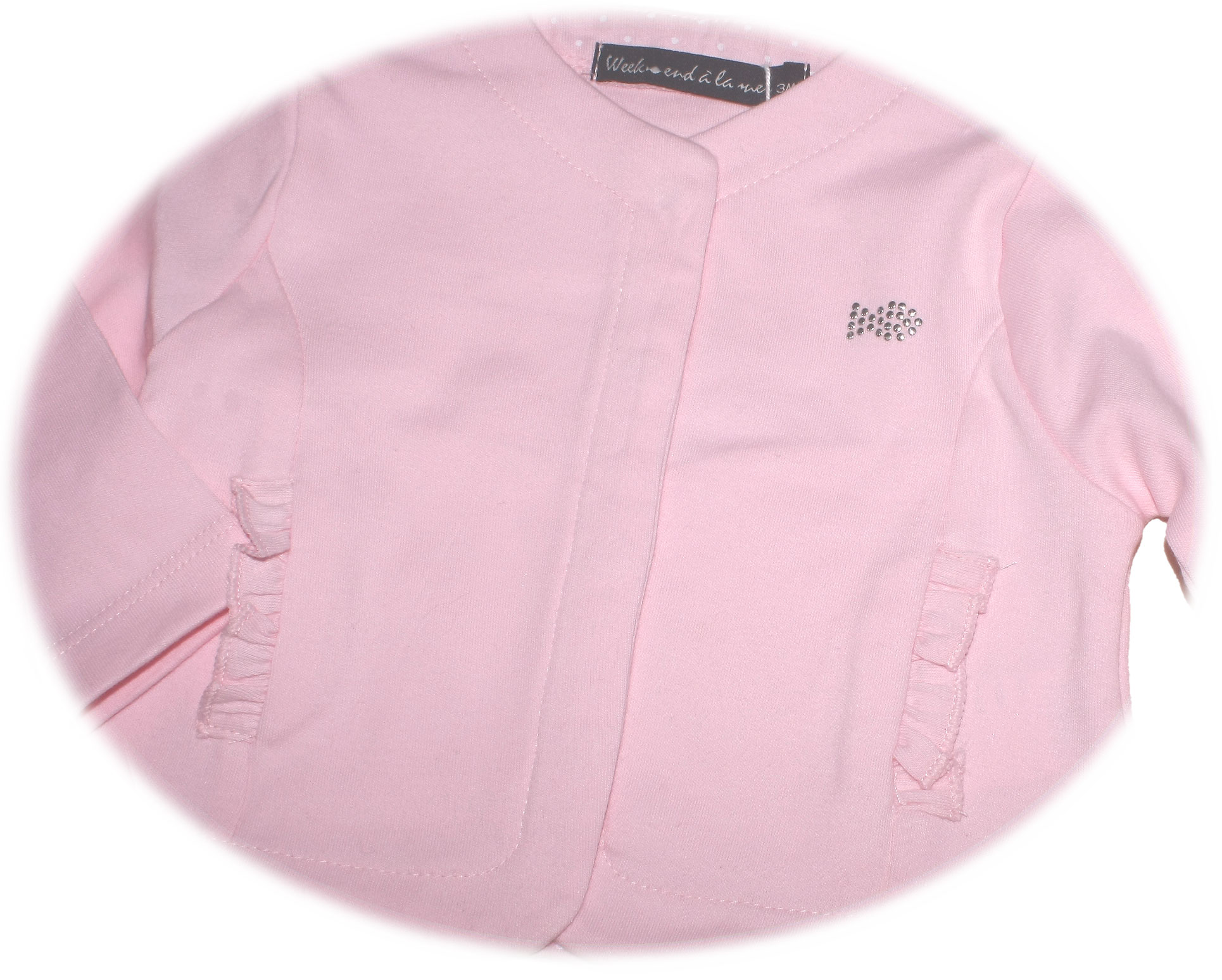 Zauberhaft schicke und ganz schlicht gehaltene Sweatjacke in einem zarten Rosa Ton mit verdeckter Druckknopfeiste und gerüschten Eingrifftaschen seitlich, für kleine Mädchen von dem französischem Label Week End A La Mer.