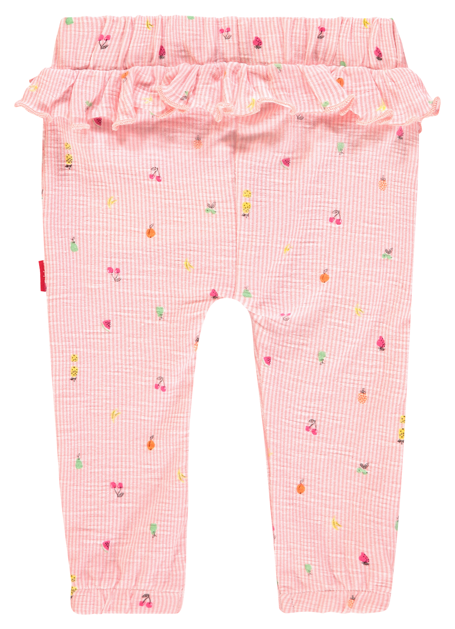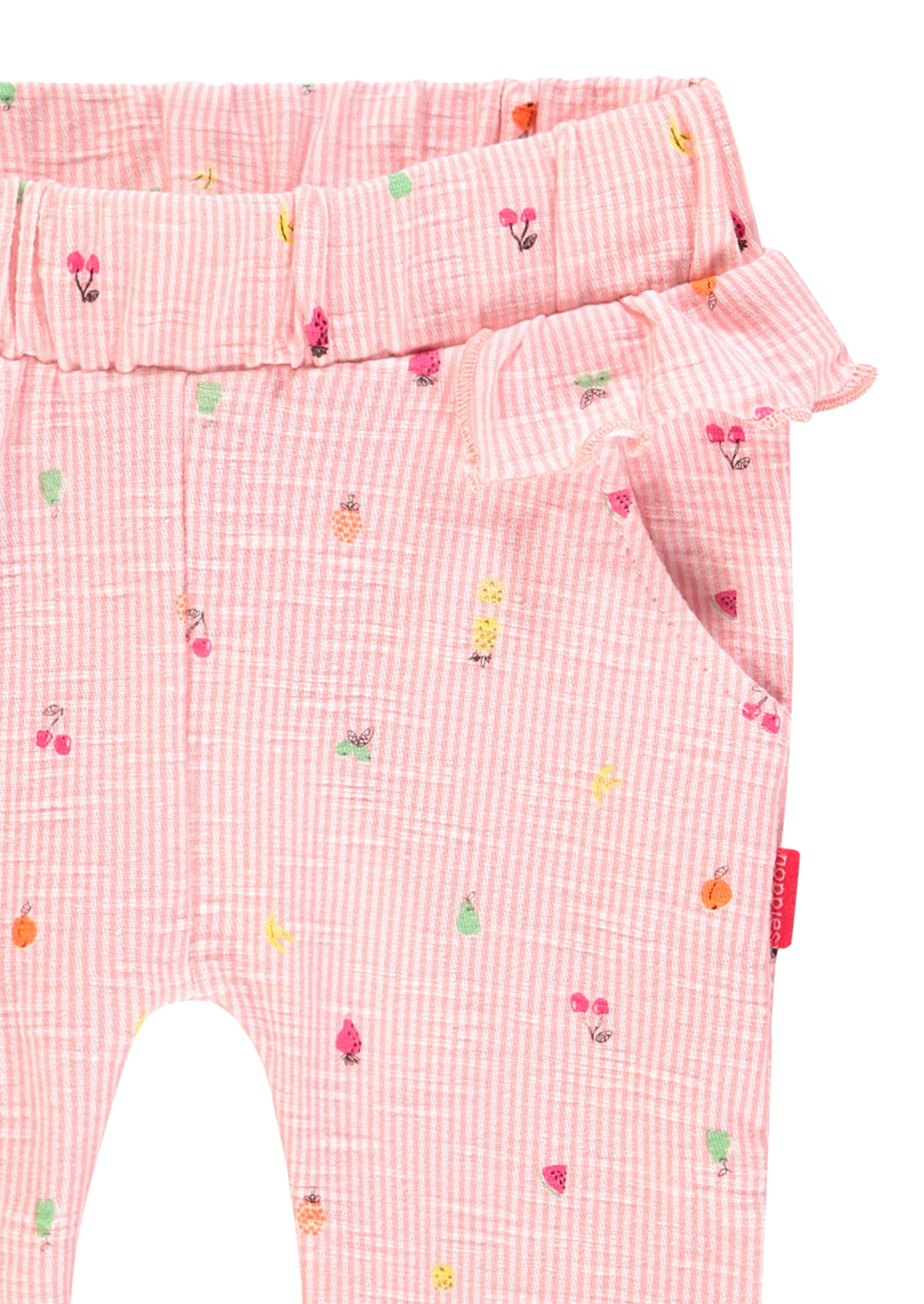 Herrlich weiche und ganz leichte lange Hose aus weichem Baumwoll Crepp in zart Rosa und Weiß gestreift mit niedlichem, buntem Früchte Muster Allover für Mädchen von dem Niederländischem Baby- , Kinder- und Schwangerschafts Label NOPPIES.