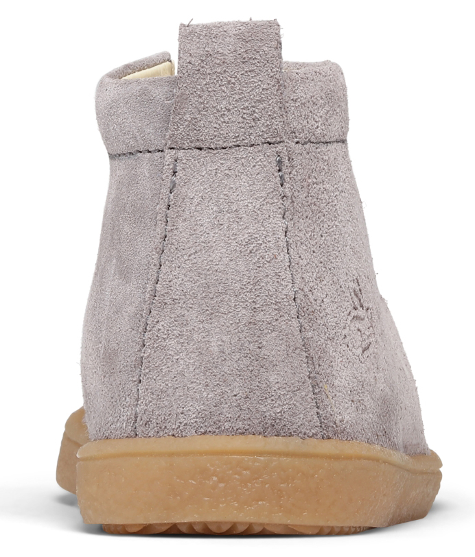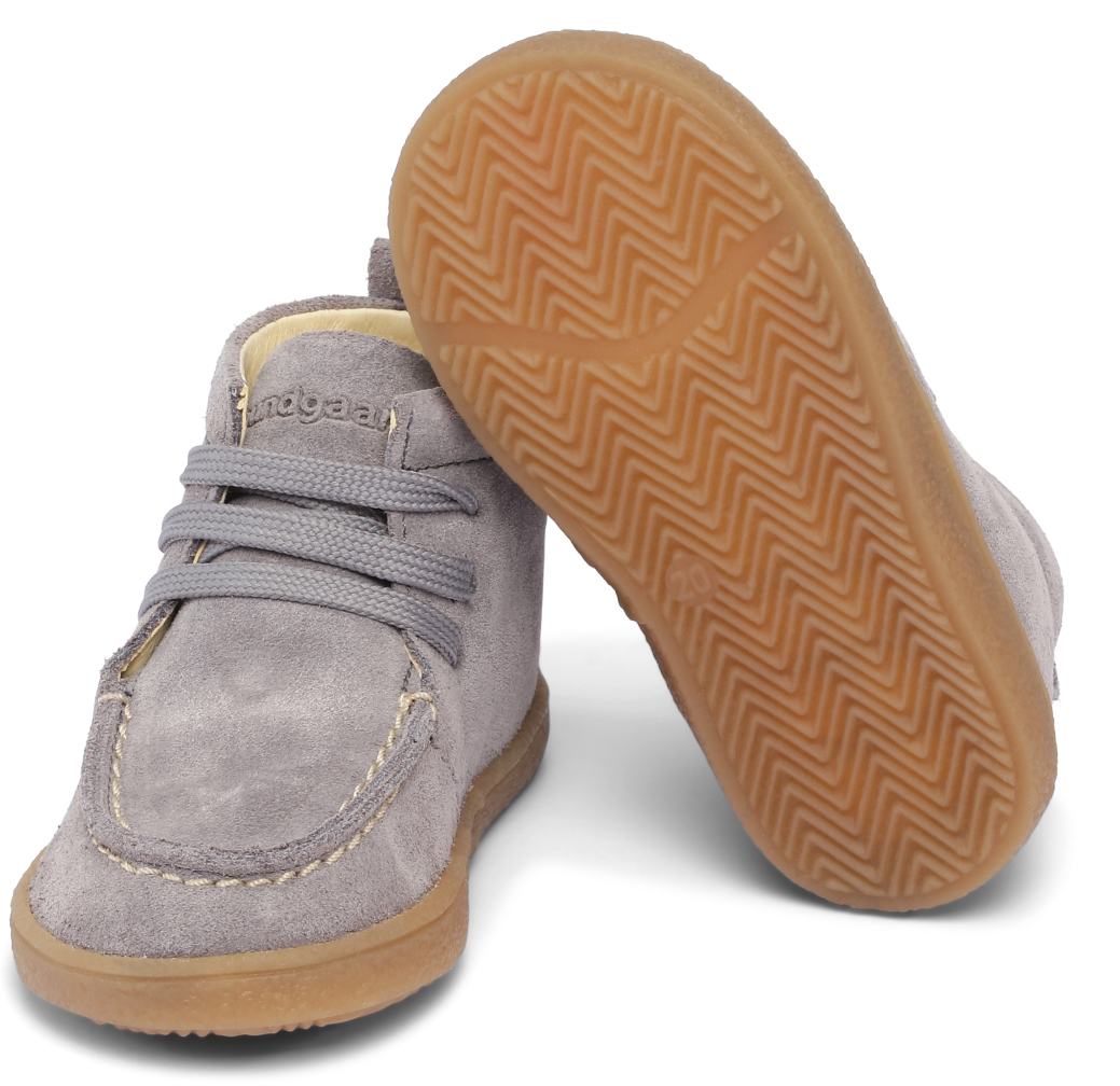 Super weicher und flexibler Mokassin / Lauflernschuh zum schnüren, in einem hellen Grau aus weichem Wildleder mit klassischer Mokassin Naht auf dem vorderen Bereich, ganz weiche und flexible Gummisohle mit gezacktem Profil, für kleine Kinder mit hohem Spann super geeignet, von dem dänischen Schuhhersteller BUNDGAARD.